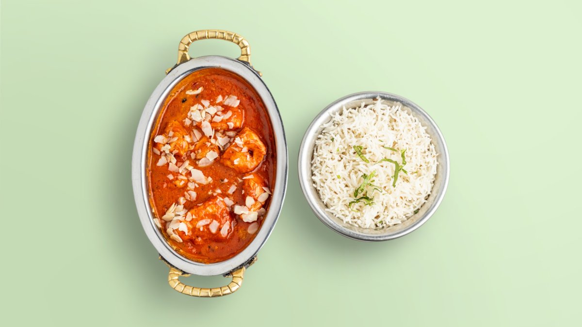 gewürztes Hähnchenfleisch in einer cremigen Tomatensoße, traditionell in einer Karahi-Pfanne gekocht und mit 3 Soßen serviert