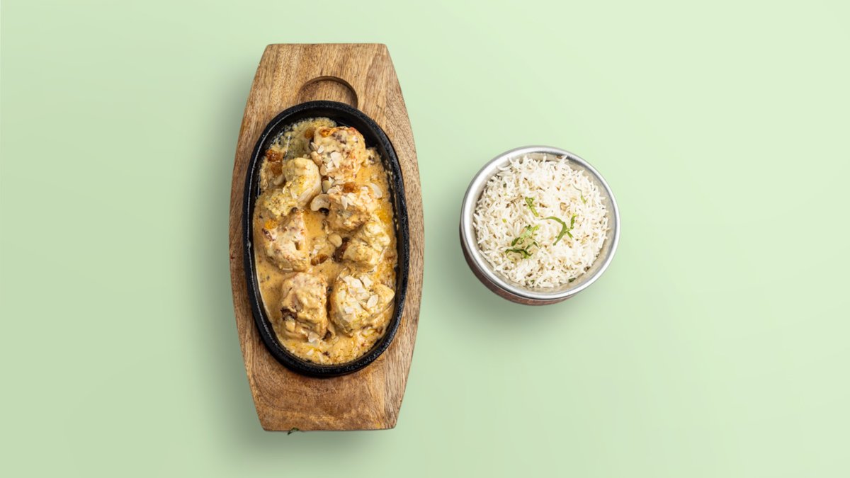 mild creamig Lammfleisch mit Rahmkäse, Rosinen, Kokosnuss, Mandeln und Safran in Sahnesoße