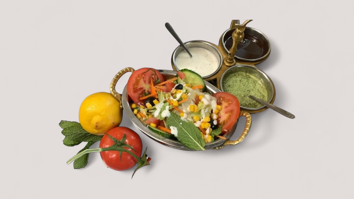 alle Gerichte werden in Kicherebsenmehl gebacken und mit 3x Soßen serviert („01. Samosas” wird nicht in Kichererbsenmehl gebacken und wird mit keiner Soße serviert )
