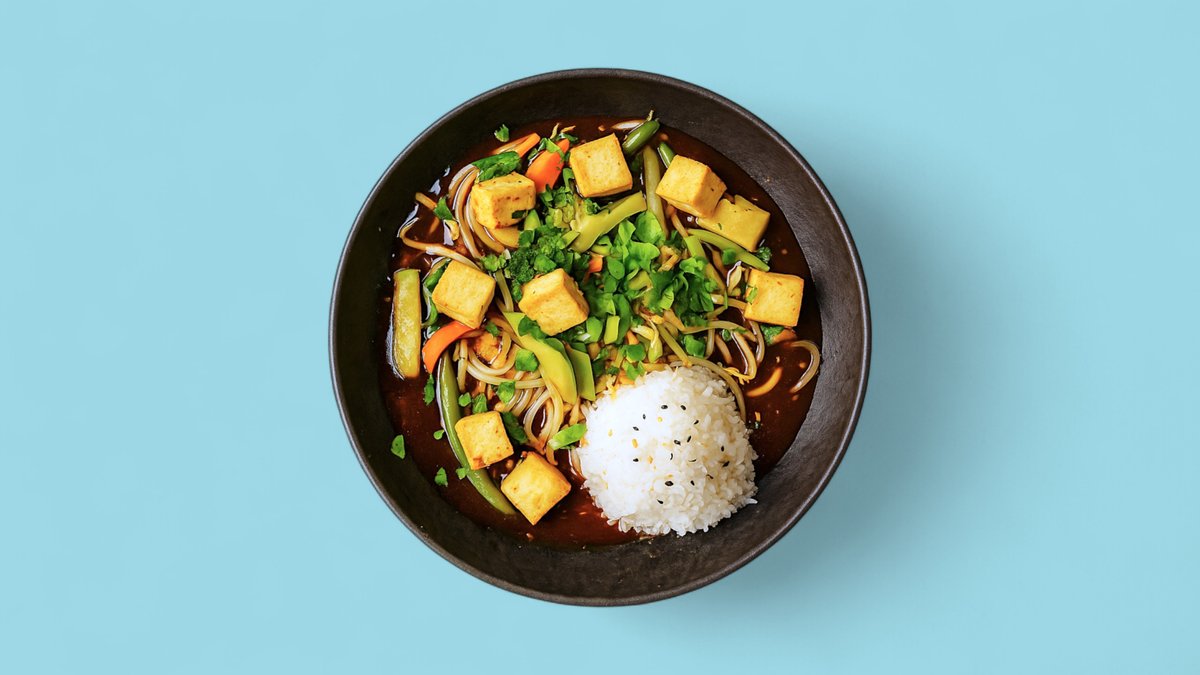 Frisch geschwenktes Gemüse in BBQ Soße, Koriander, Frühlingszwiebeln, Jasminreis und…