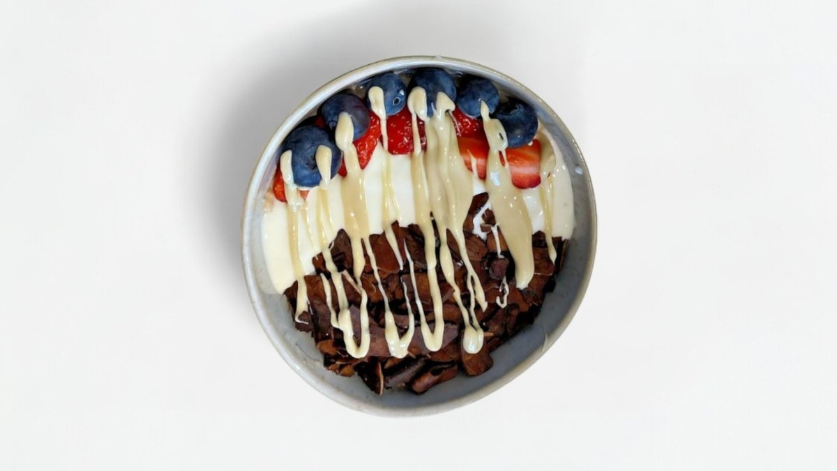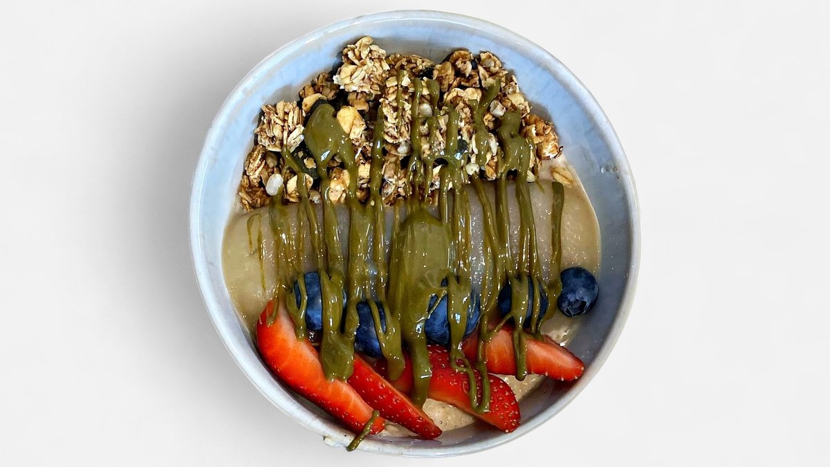 creamy porridge, soy-coconut yogurt, dark coconut chips, fresh berries, cashew nut butter.