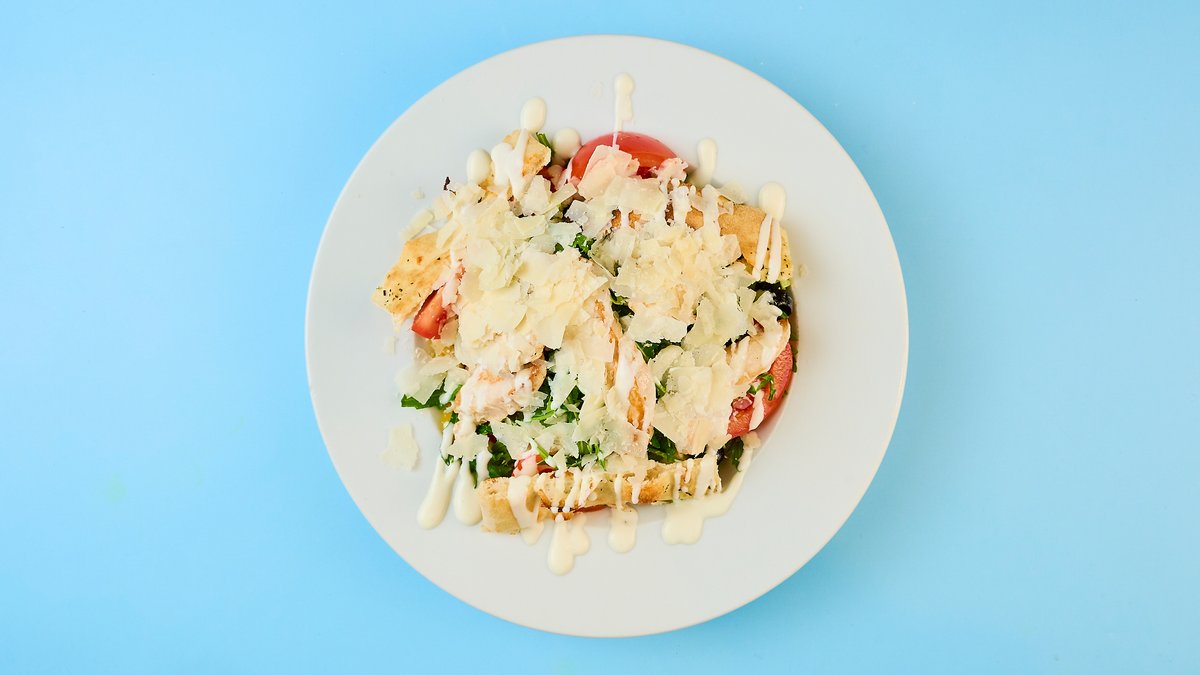 scharf gebratene Hähnchenbruststreifen, Römersalat, Croutons, Cherrytomaten, Parmesan und Caesar-Dressing