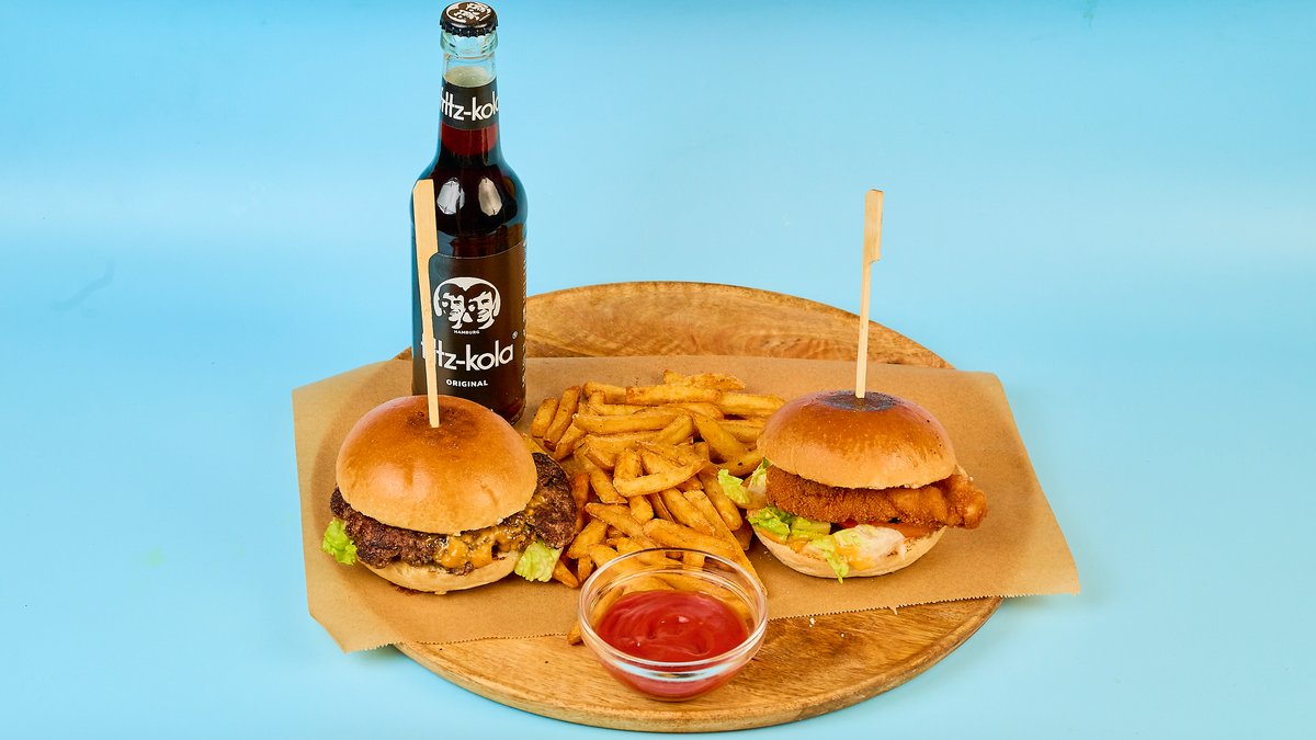 1x Cheeseburger 1x Crispy Chicken Burger jeweils mit Eisbergsalat, Tomate, Gewürzgurken, Zwiebeln und Burgersoße 1x Fingerfood 1x Getränk