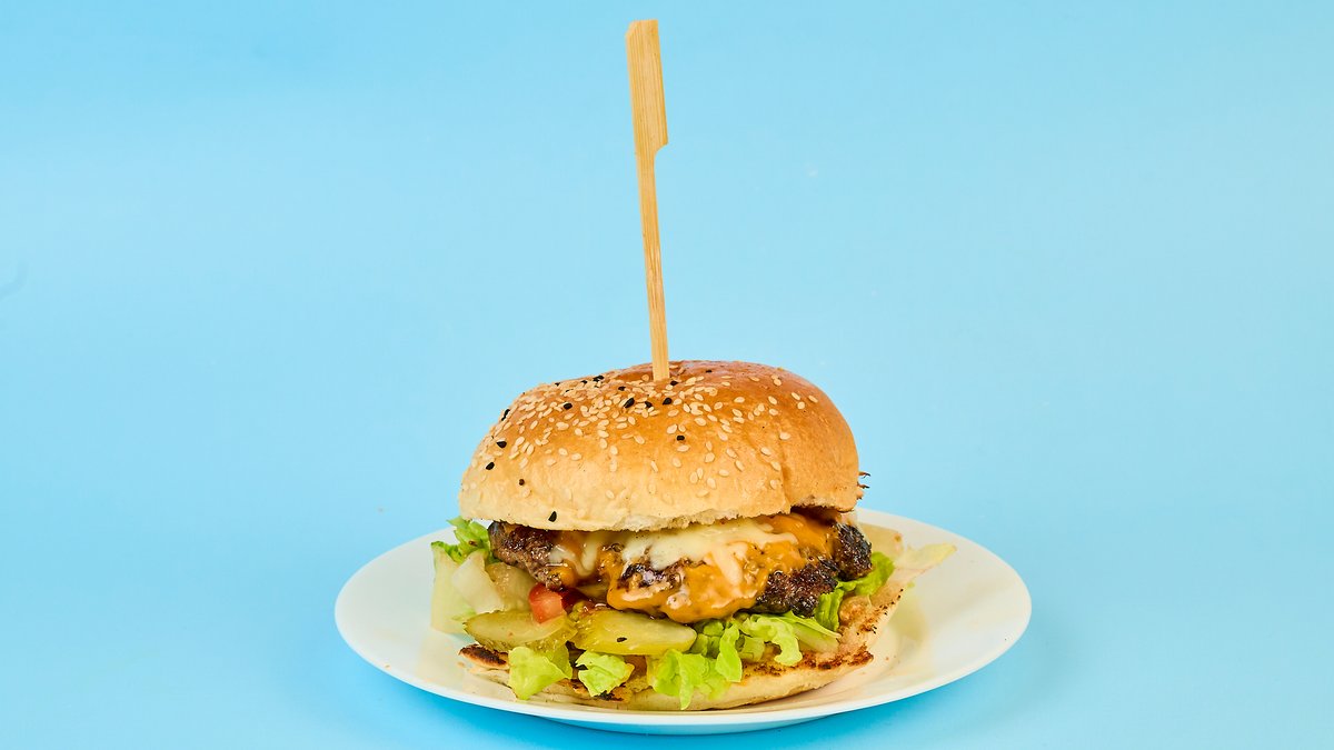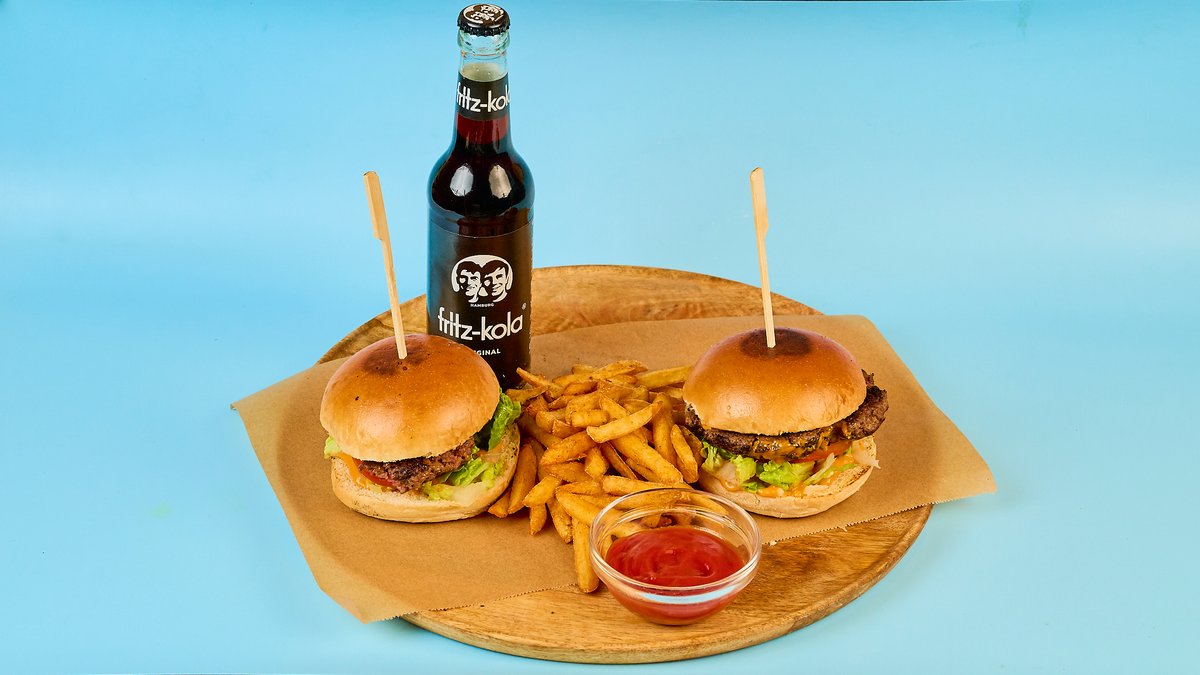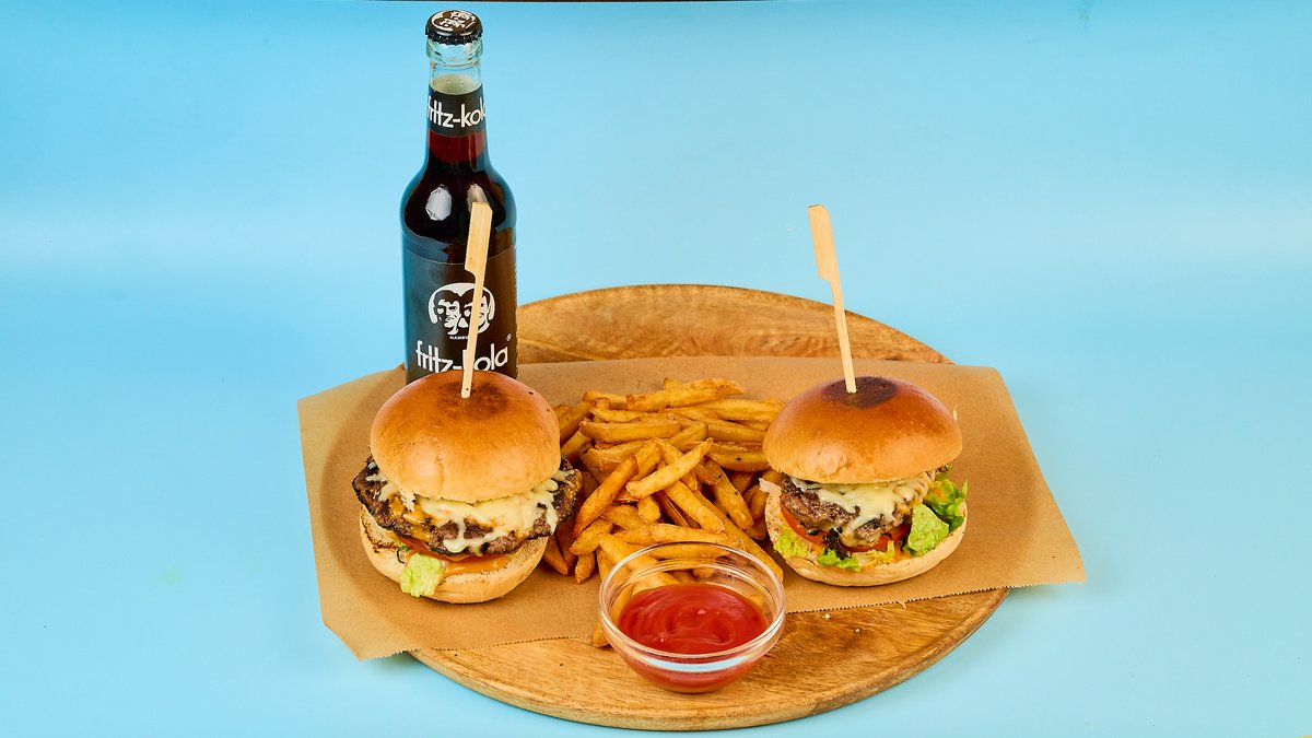 2x Hamburger mit Rindfleisch, Eisbergsalat, Tomate, Gewürzgurke, Zwiebeln und Burgersoße 1× Fingerfood 1x Getränk