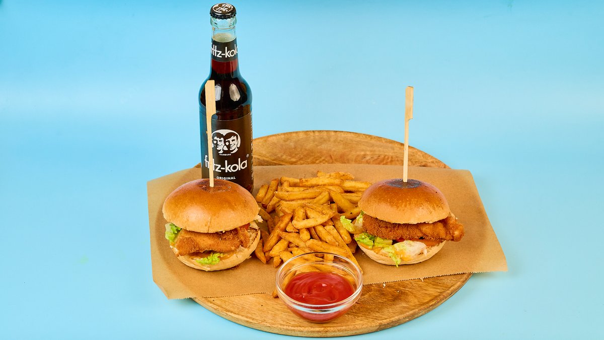2x Crispy Chicken Burger mit knusprigem Hähnchen, Eisbergsalat, Tomate, Gewürzgurken, Zwiebeln und Burgersoße 1x Fingerfood 1x Getränk