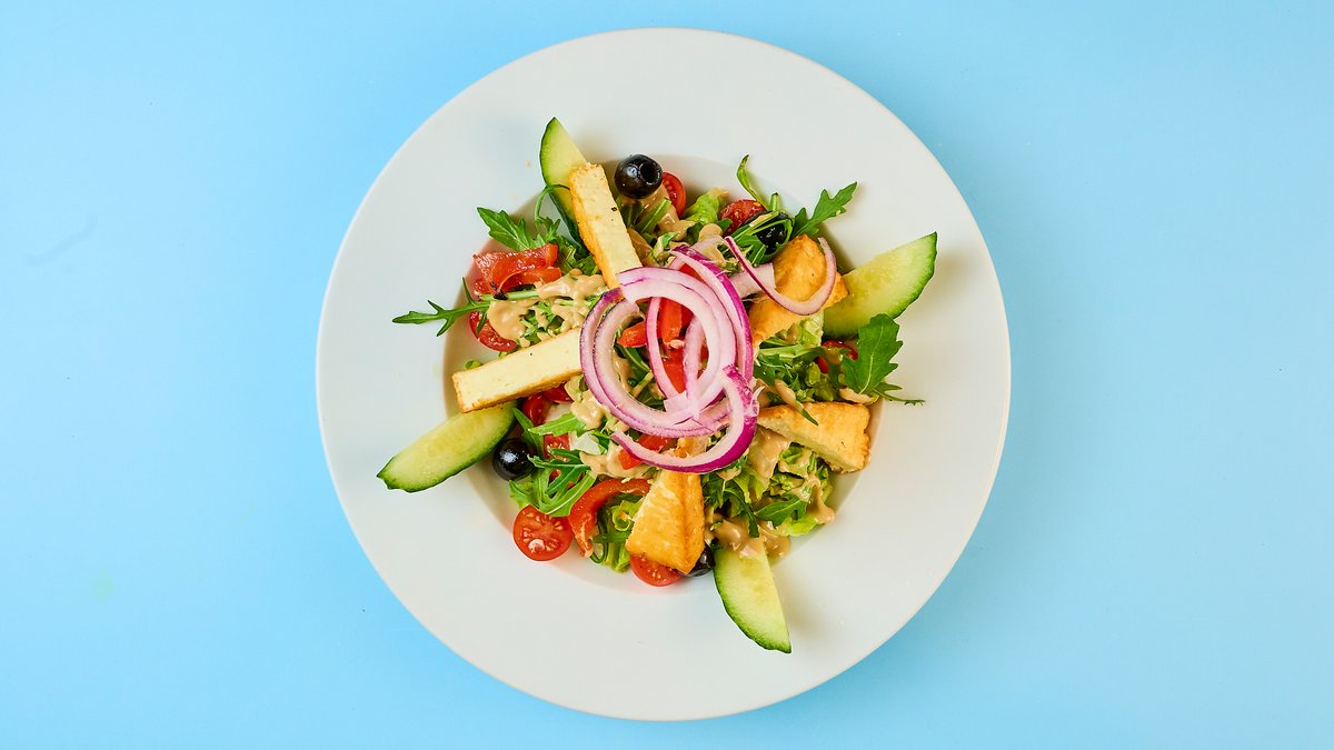 alle Salate werden mit Gurken, Mais und Oliven zubereitet und mit Balsamico-Dressing serviert (außer Caesar Salat)