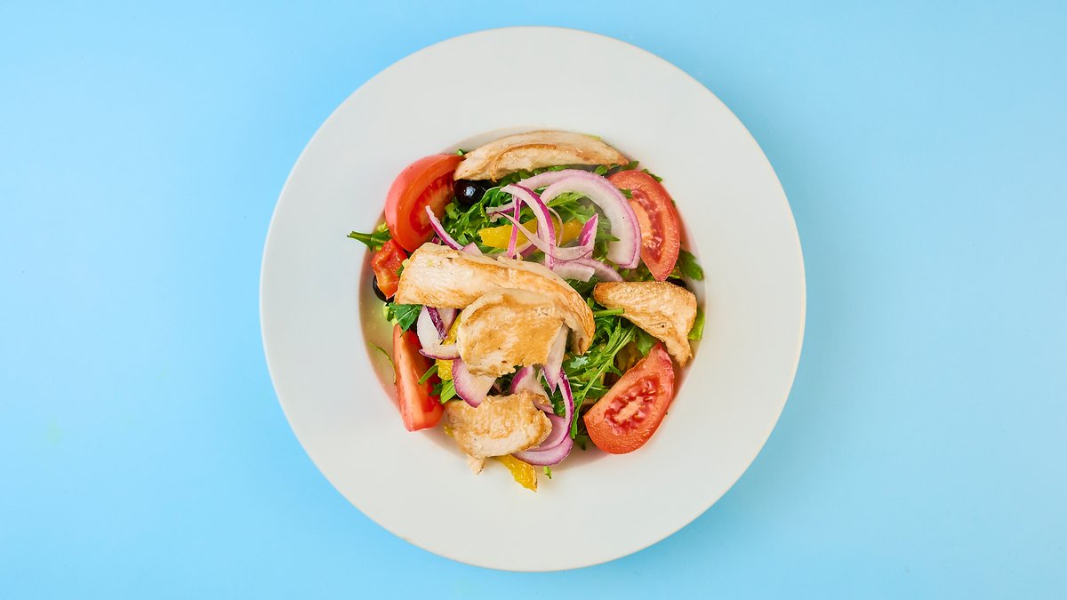 klassischer Salat mit scharf gebratene Hähnchenbruststreifen mit Cherrytomaten