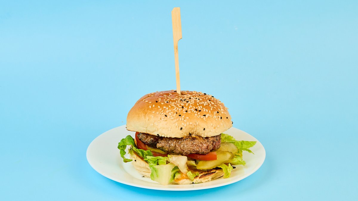 mit 130 g Rindfleisch-Patty, Tomaten, Gewürzgurken und Zwiebeln