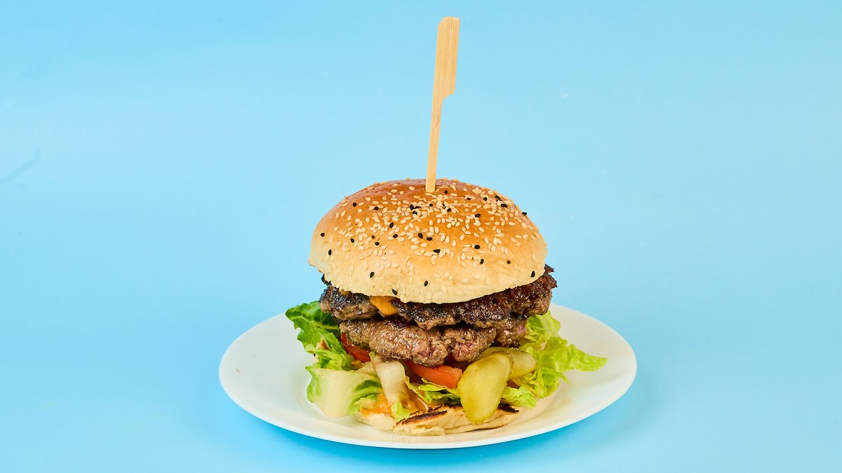 mit 2x130 g Rindfleisch-Patty, Tomaten, Gewürzgurken und Zwiebeln