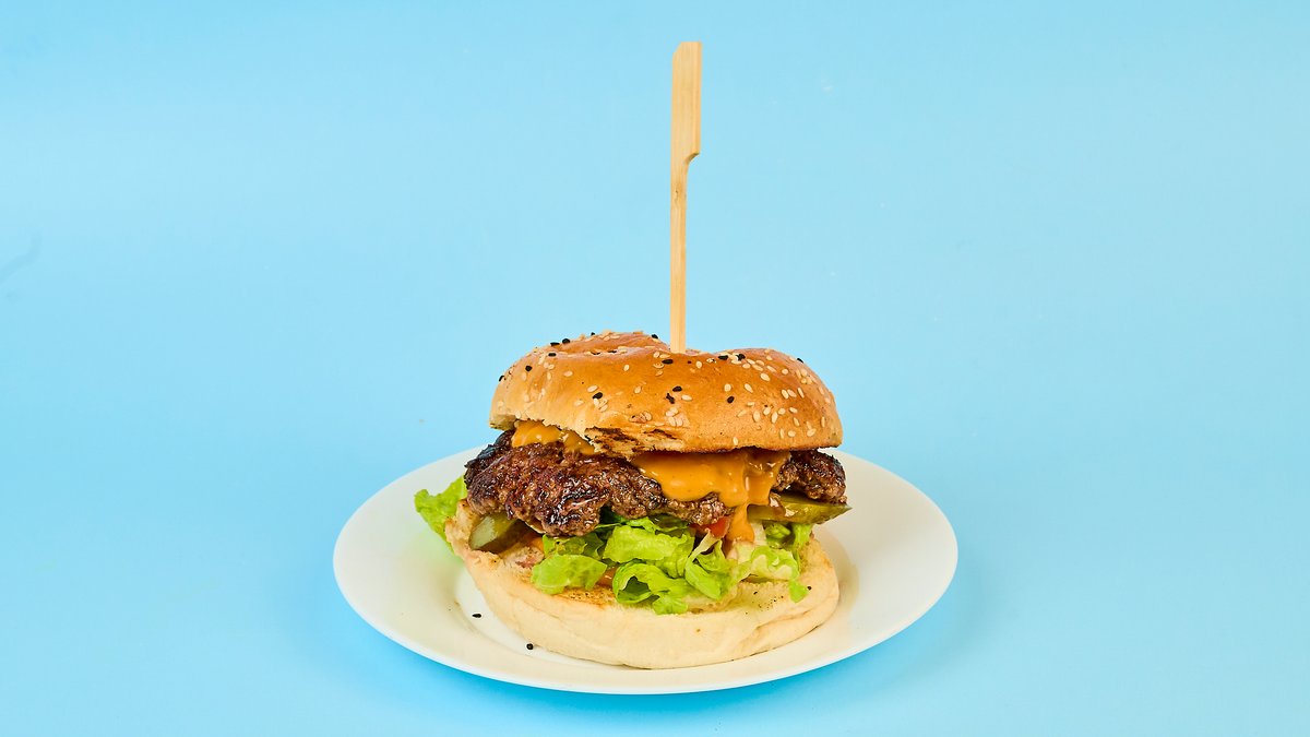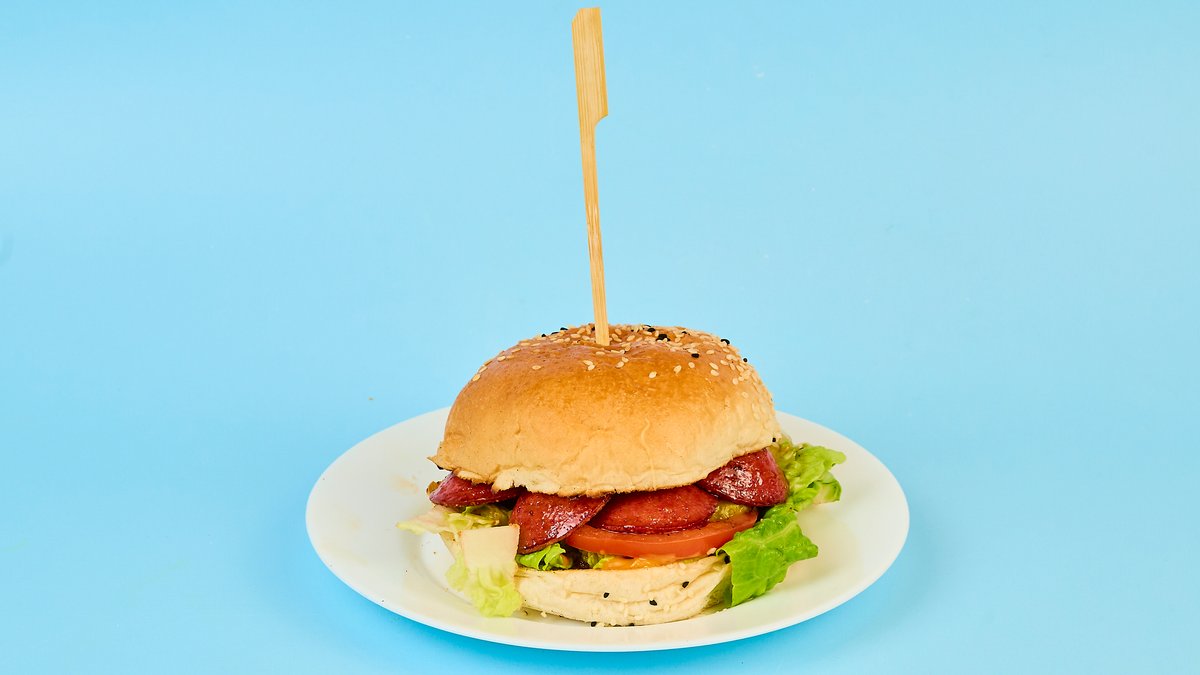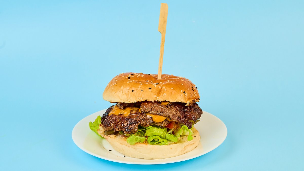 mit 150 g Rindfleisch vom Grill, türkischer Knoblauchwurst vom Rind, Cheddar, Strauchtomaten, Gewürzgurken und roten Zwiebeln