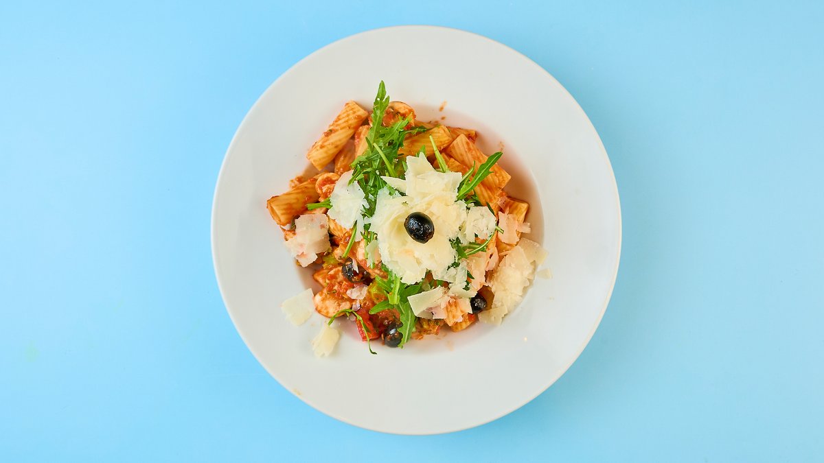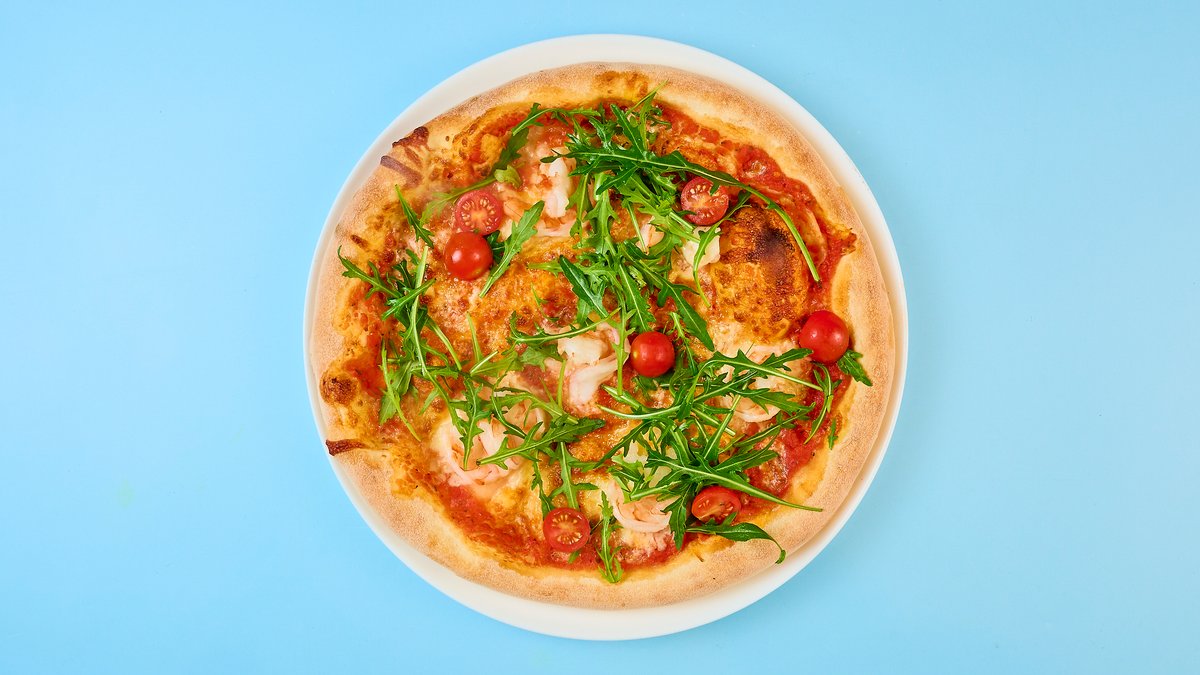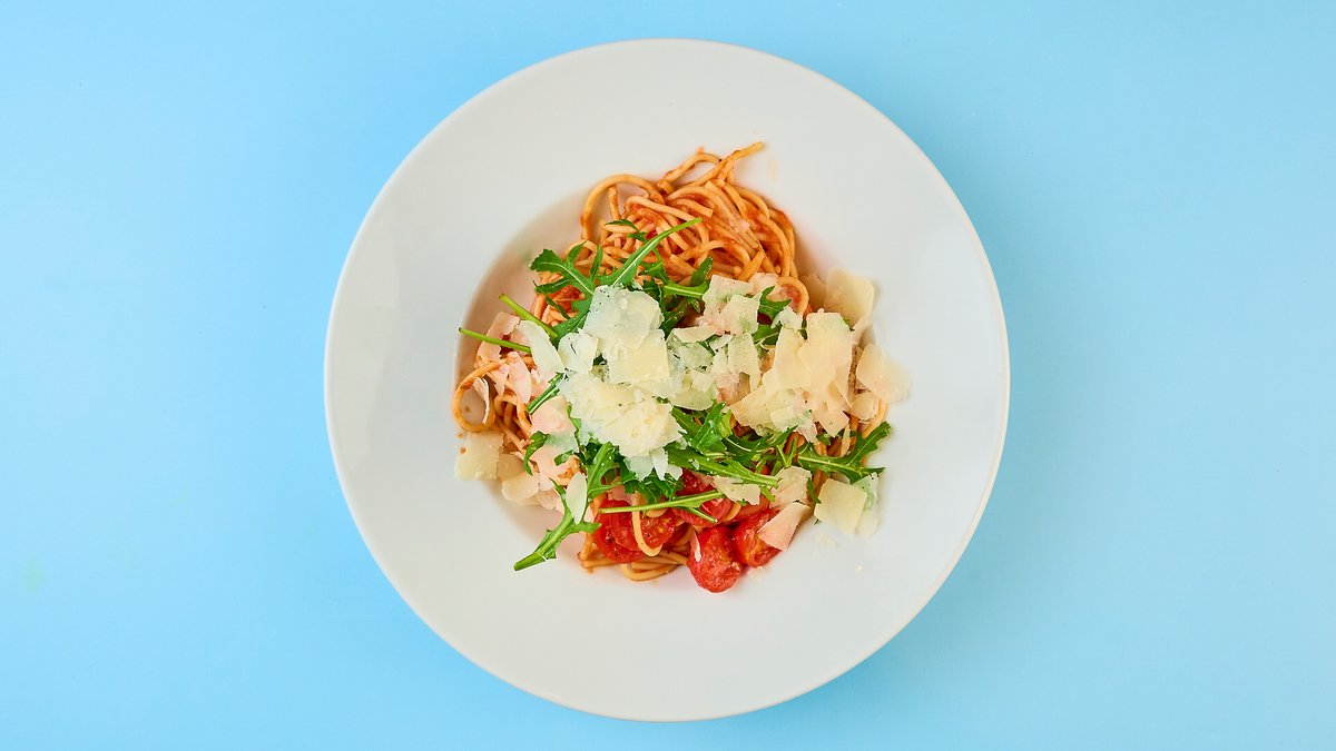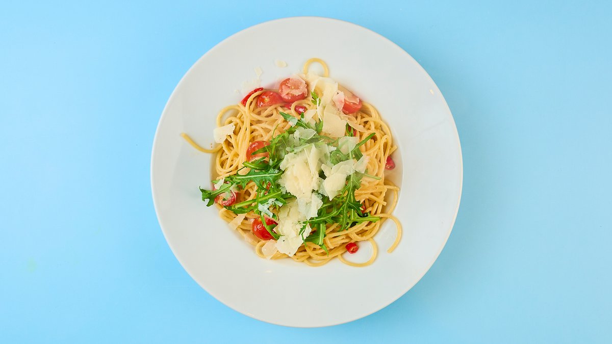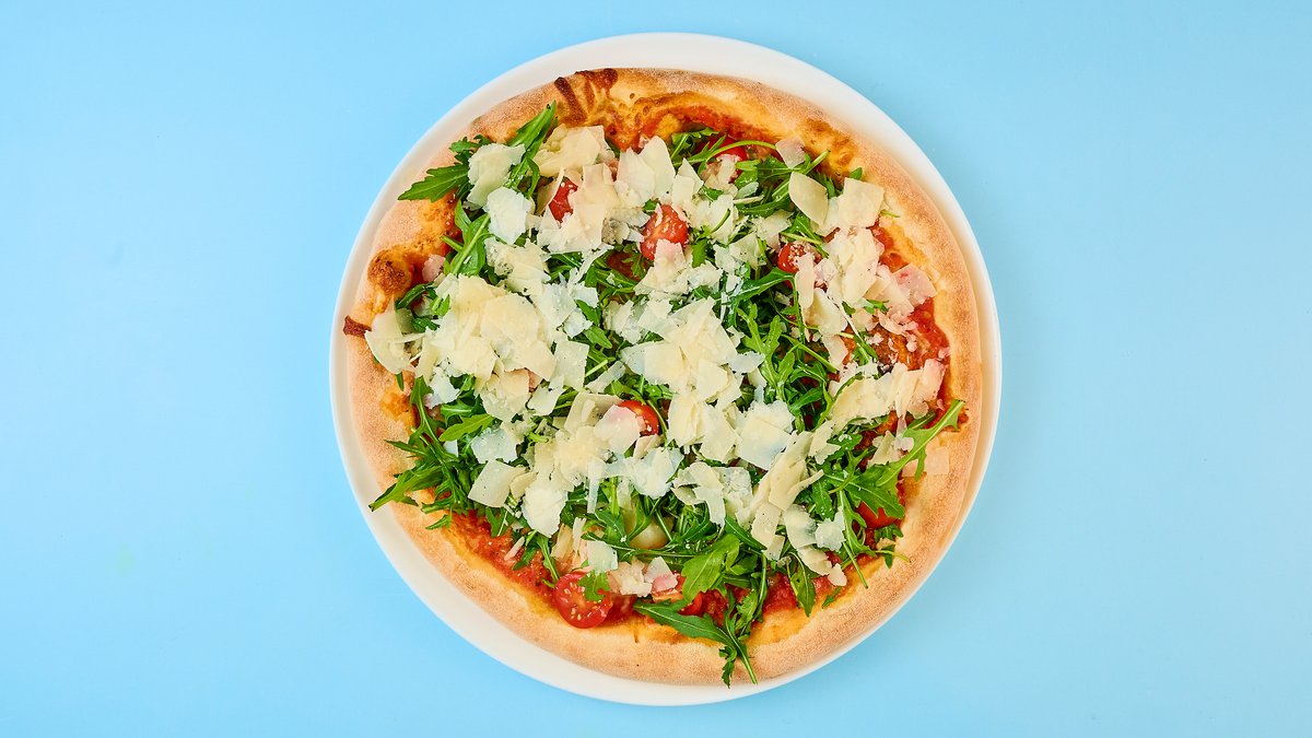 mit frischem Rucola, Parmesan und Kirschtomaten
