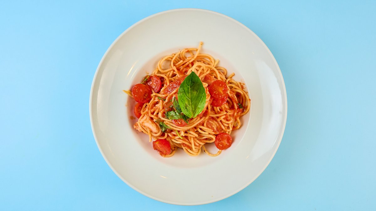 mit frischen Garnelen in pikanter Tomatensoße, Kirschtomaten, Knoblauch und Kräutern
