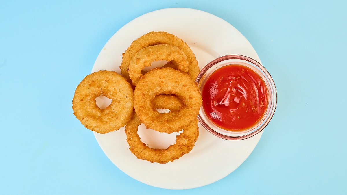knusprig frittierte Zwiebelringe, serviert mit Dip (Ketchup, Mayonnaise, Senf und sauren Gurken)