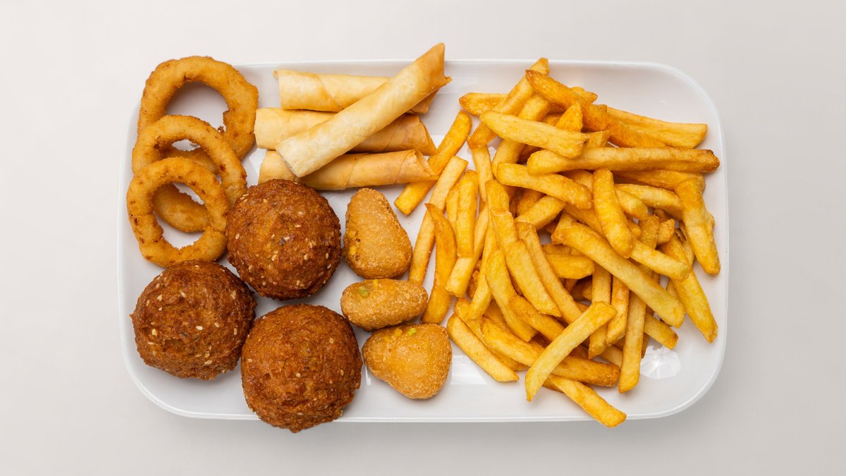 2x Blätterteig 2x Falafel 2x Gemüsebouletten 3x Zwiebelringe 3x Chili Cheese Nuggets kleine Pommes frites