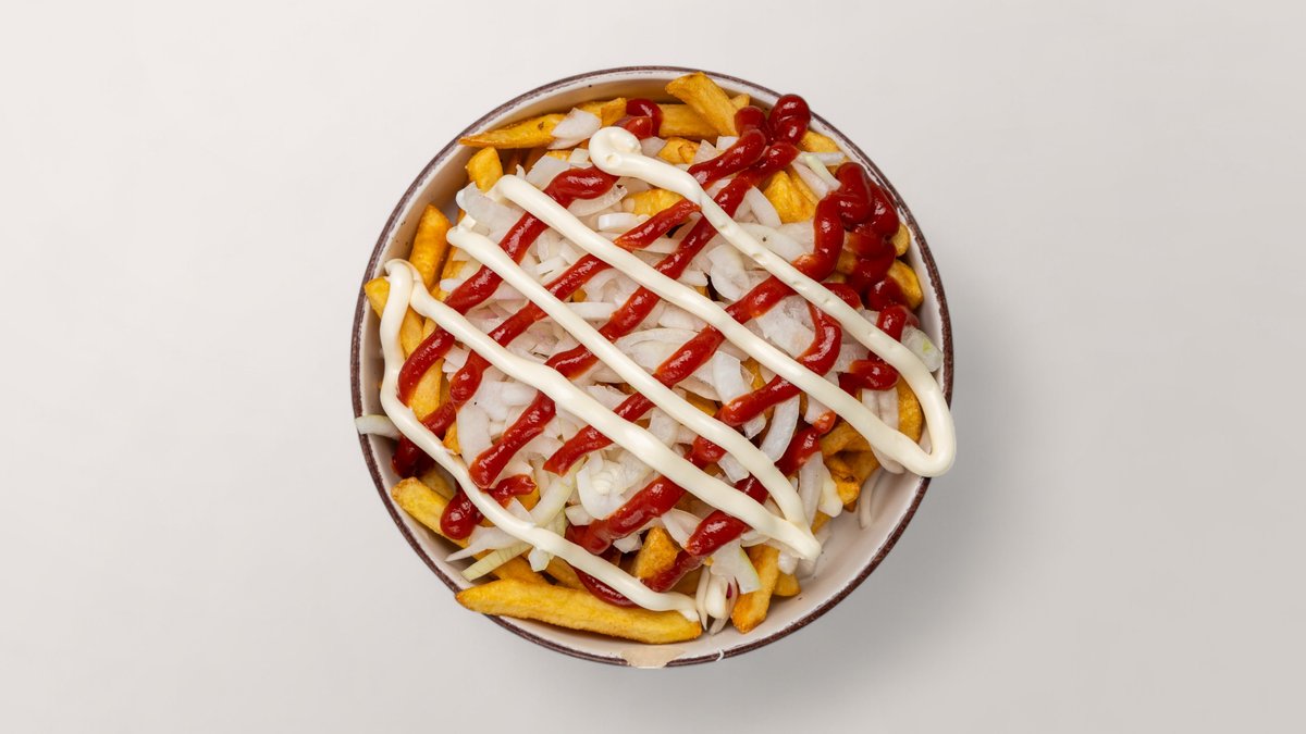 mit frischen gehackten Zwiebeln, Ketchup und Mayonnaise