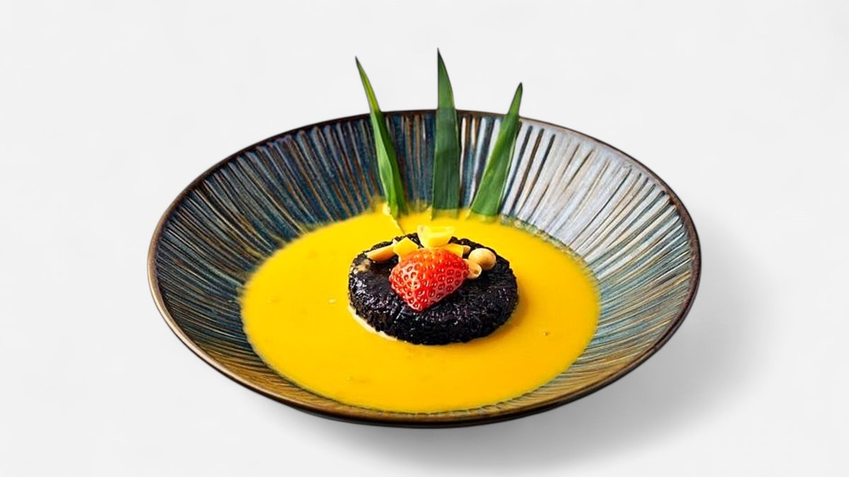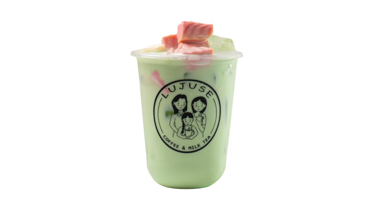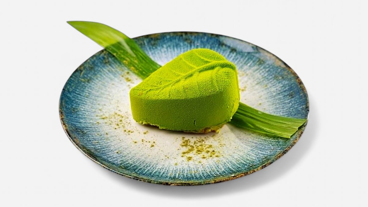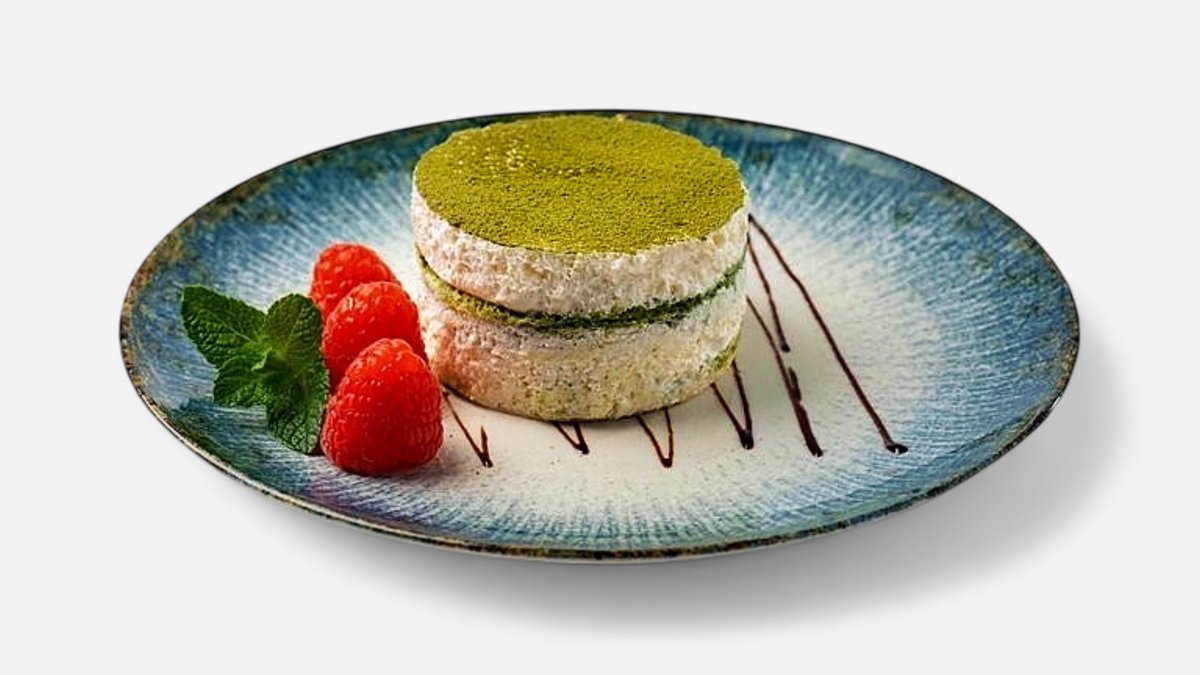 mith Kokosnuss-Dacquoise-Biskuit, exotischem Fruchtgelee, Matcha und Schokoladenmousse Das Gericht wurde mit Schokolade zubereitet und kann Spuren von verschiedenen Nüssen enthalten