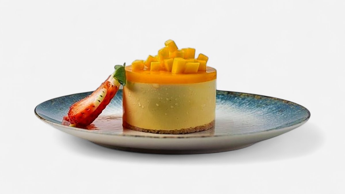 mit Kokosnussboden, Mango-Käse-Mousse und Mango-Gelee