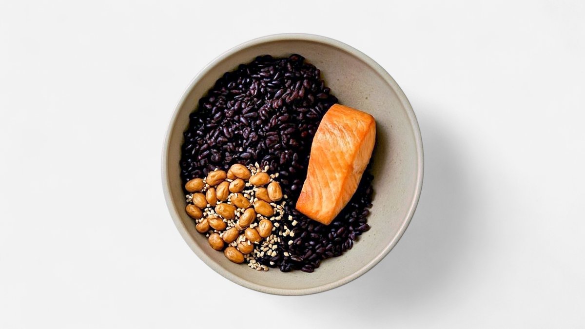 mit gegrilltem Lachsfilet, braunem Reis, Sesamsalz, Erdnüssen und hausgemachter Soße