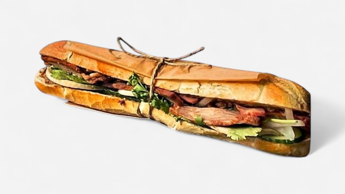 Baguette mit gegrilltem mariniertem Schweinefleisch, vietnamesischer Wurst und Koriander