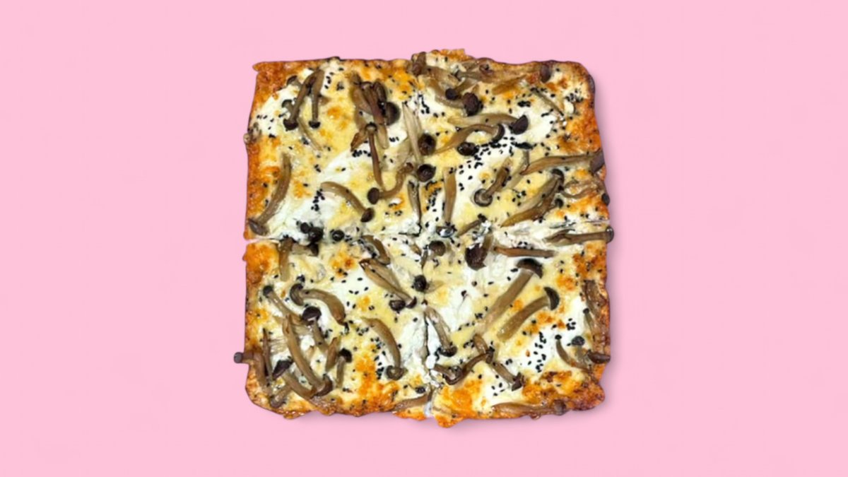 glutenfreier Teig mit weißer Soße, Mozzarella, Shimeji-Pilzen, Ricotta, MJ’s Trüffelöl, Parmesan und karamelisierter Käsekruste