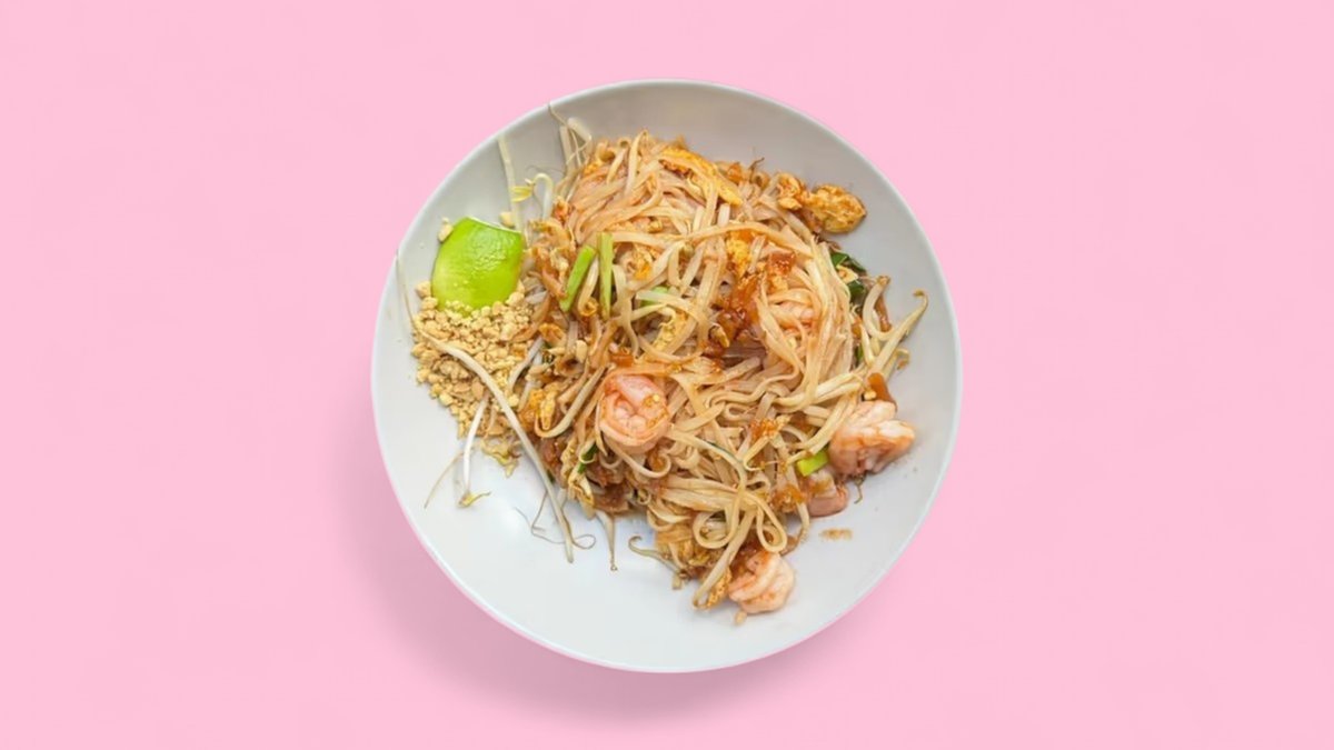 slightly spicy fried rice noodles with a spicy sauce, eggs, bean sprouts, spring onions and peanuts