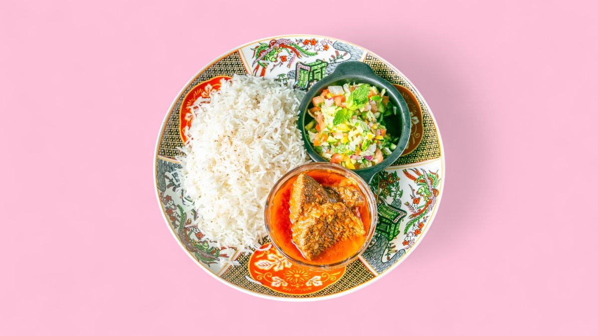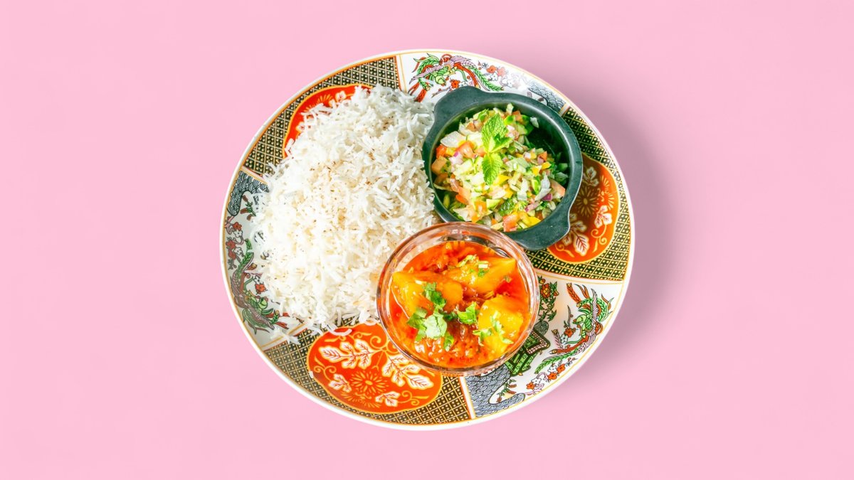 Weißer Basmati Reis mit Kartoffeln in einer leckeren gewürzten Sauce, dazu frischen kleingehackten Salat