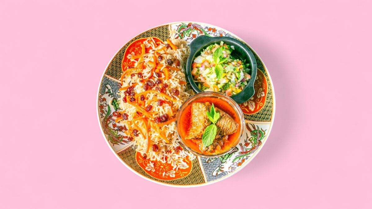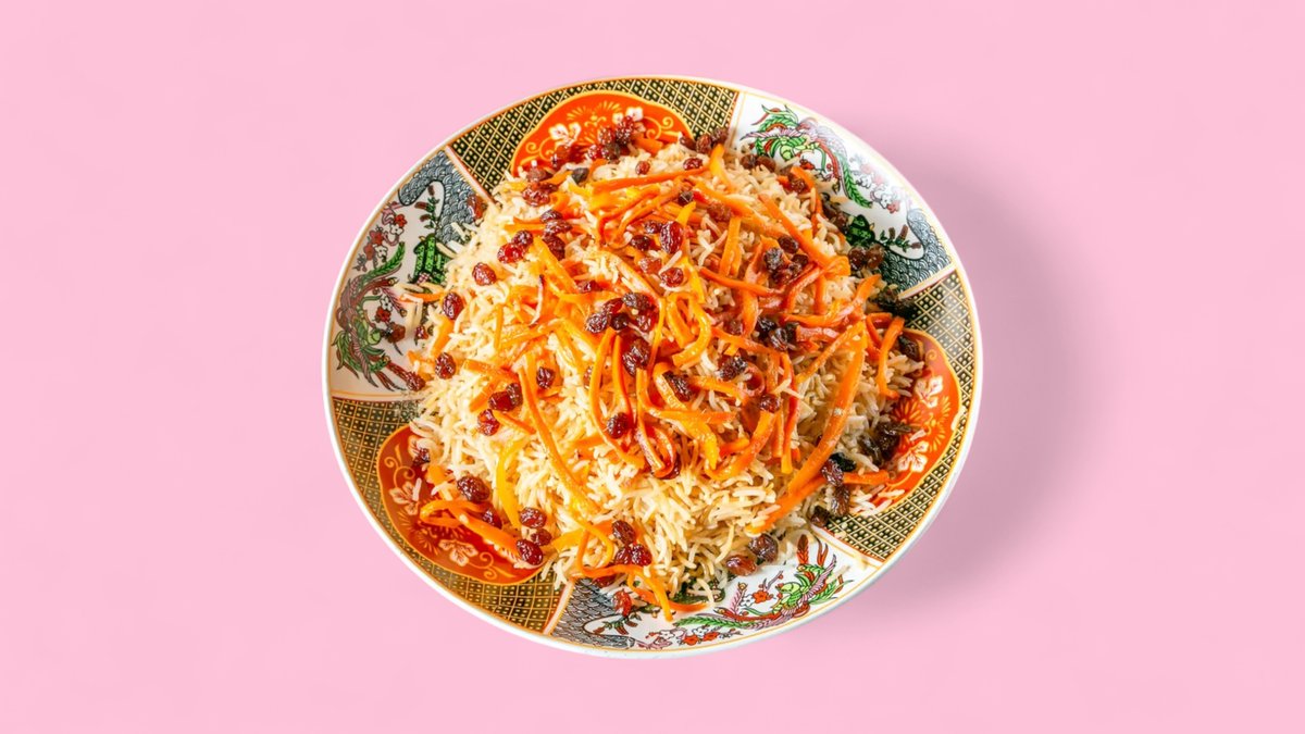Traditioneller afghanischer Basmati Reis aufgesogen in einer Kalbsfleischbrühe mit Rosinen, Karotten, dazu im Reis zartes saftiges Kalbfleisch und frischen kleingehackten Salat