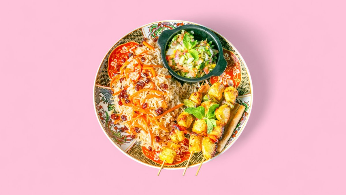 Kabuli mit Kabobe Sikhe Murgh (HALAL)
