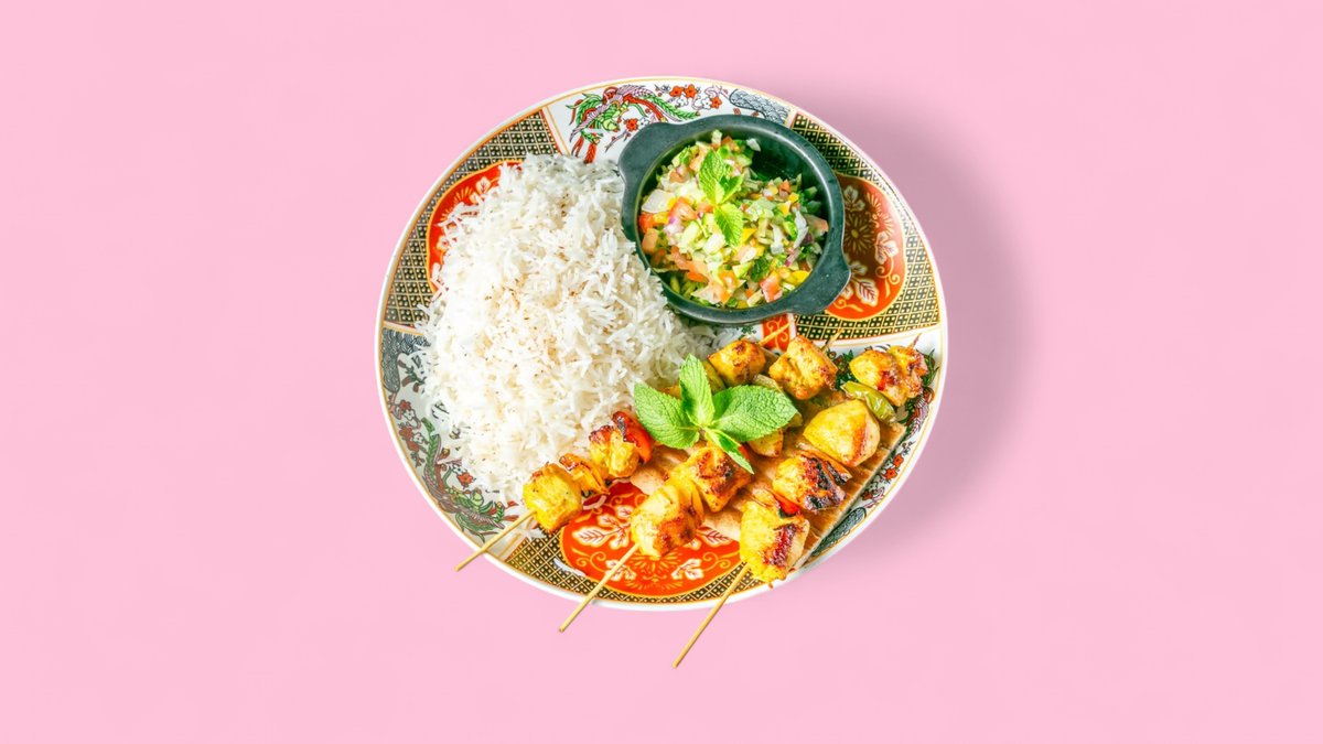 Weißer Basmati Reis mit 3 saftigen Hähnchen spießen mit Paprika Stücken und dazu frischen kleingehackten Salat