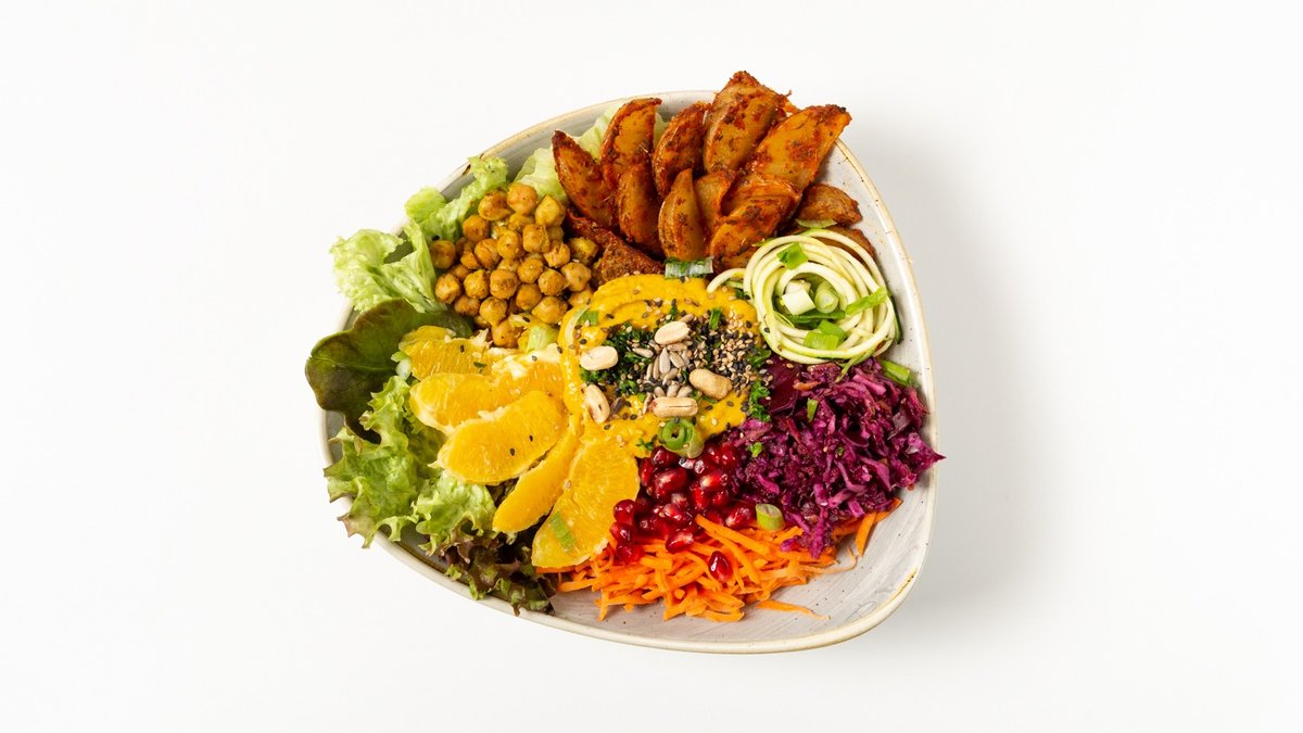 mit Vollkornreis & Quinoa, Avocado, gebackenen Süßkartoffeln, Kichererbsen, Tomaten, Soja Chunks, hausgemachtem Hummus, Salatmix, Karotten, frischen Kräutern, Sesam & hausgemachtem Hausdressing