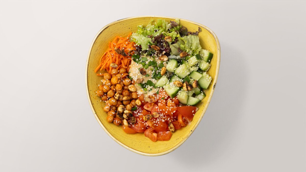 mit Tomaten, Gurke, Kichererbsen, Salatmix, Möhren, Erdnüssen, hausgemachtem Hummus, frischen Kräutern, Erdnüssen, Sesam & hausgemachtem Hausdressing