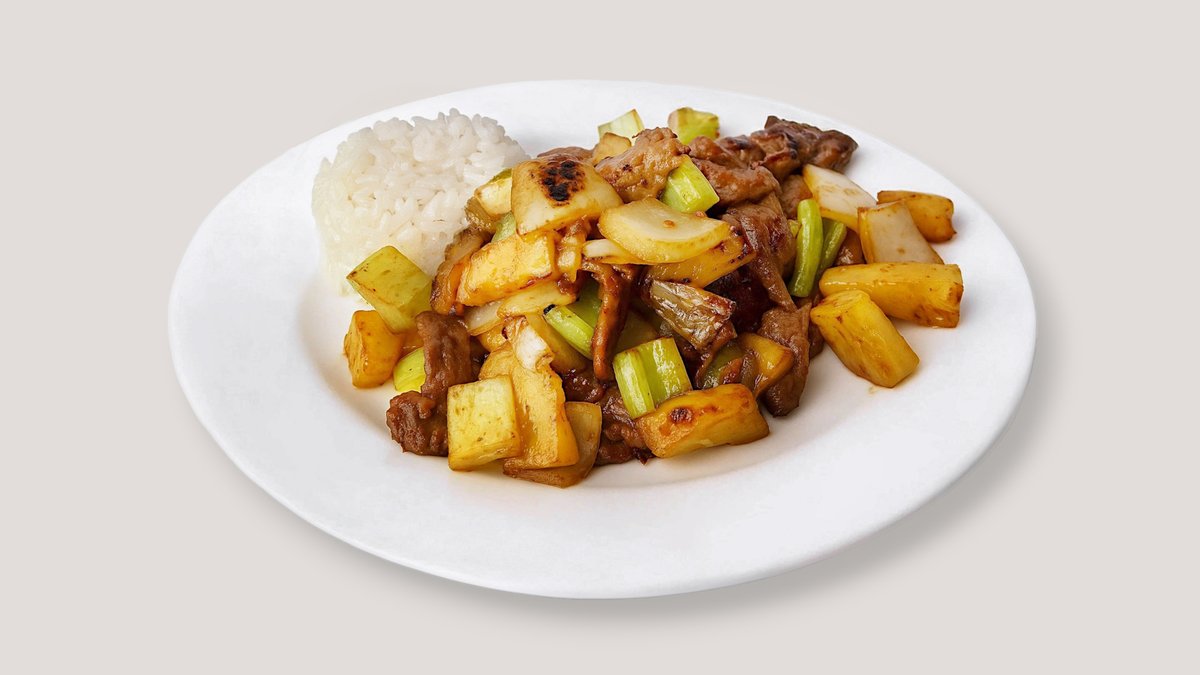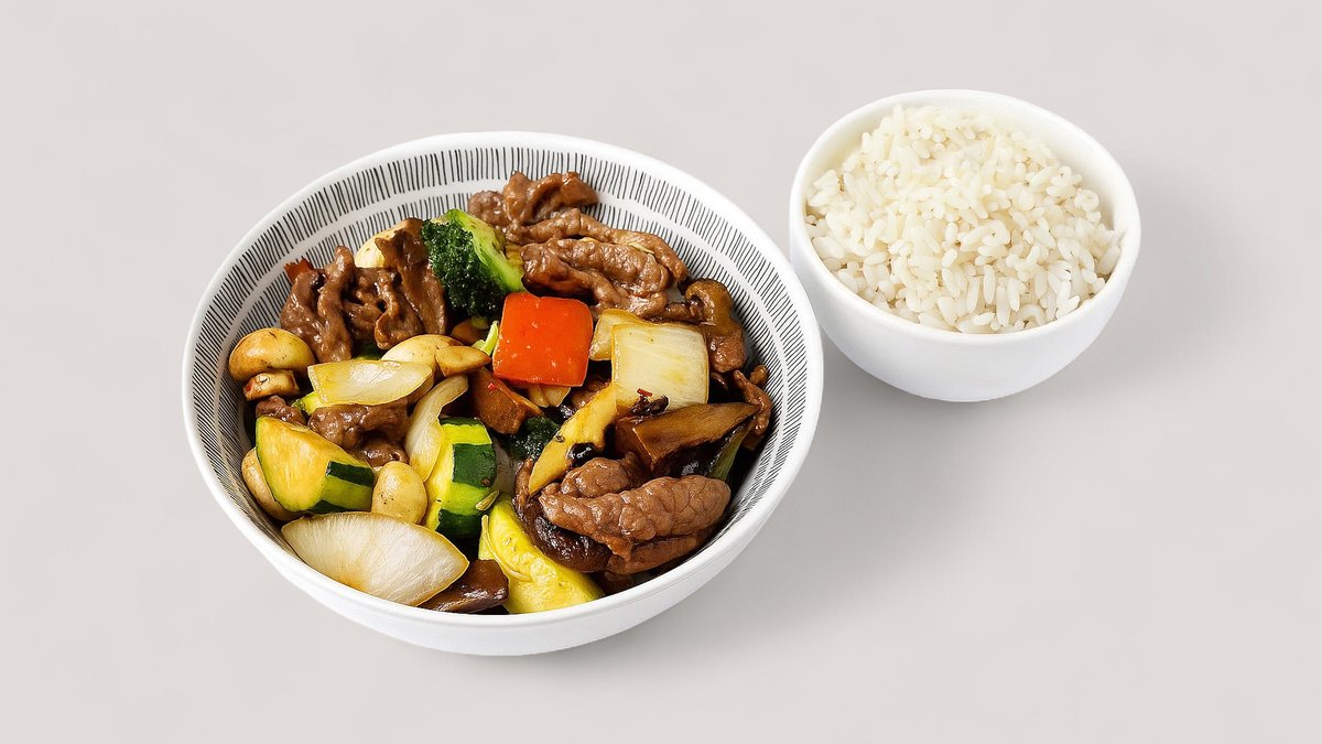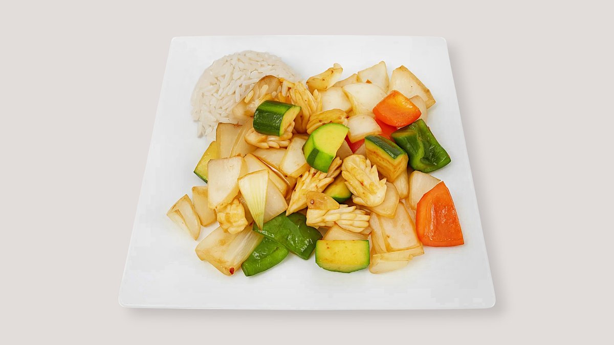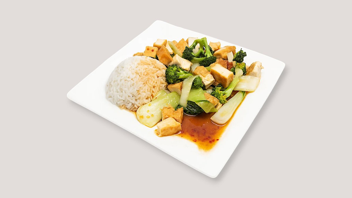 mit Sojasprossen, Knoblauch und einer Reisbeilage
