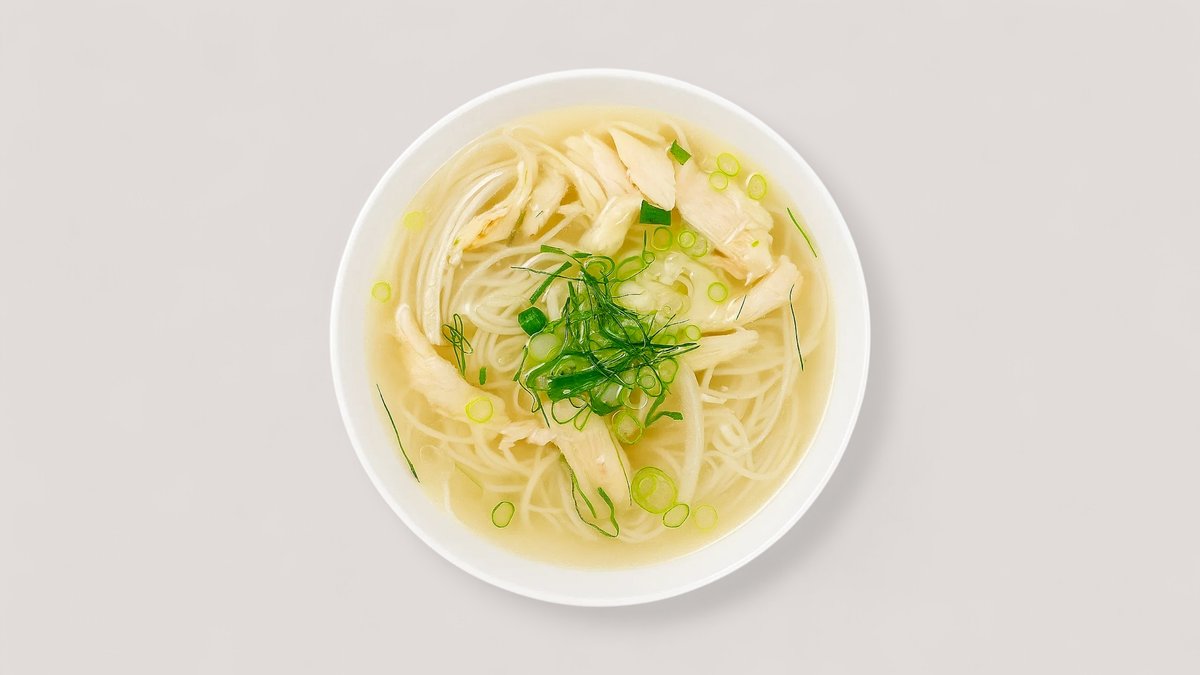 Reisbandnudelsuppe mit Hühnerfleisch, Sojasprossen und frischen Kräutern