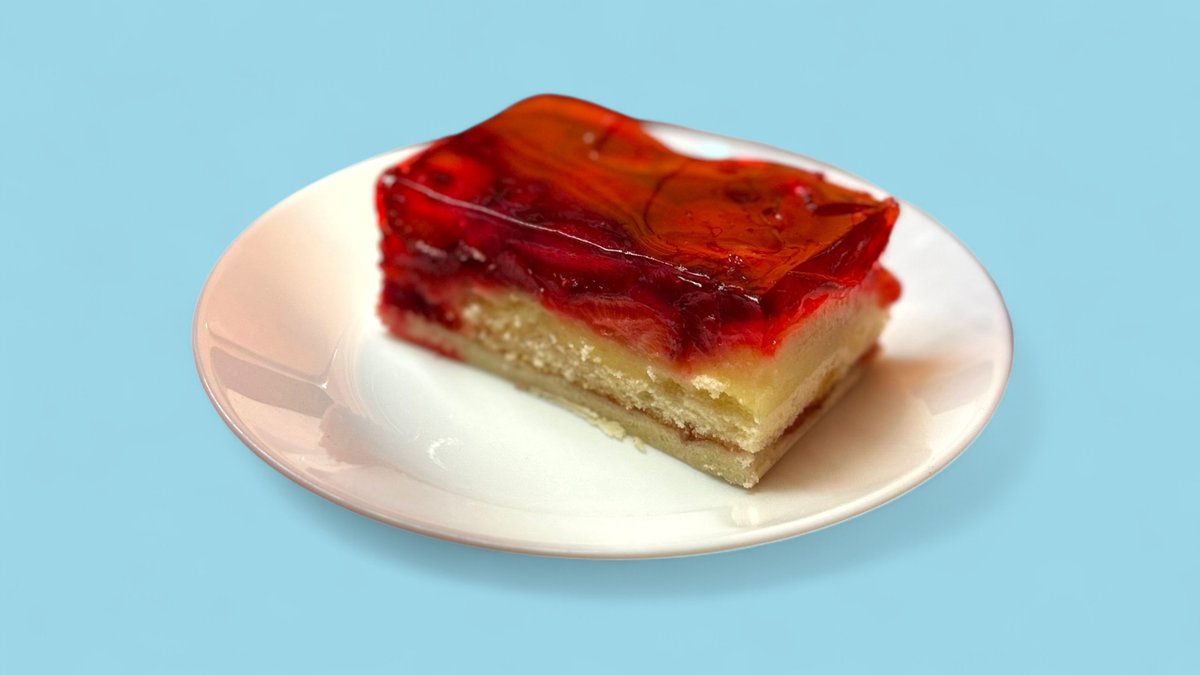 Siedegebäck mit Himbeerfüllung und weißem Fettglasurüberzug, dekoriert mit kakaohaltigen Fettglasurstreifen, gefriergetrockneten Johannisbeeren und Keksstückchen