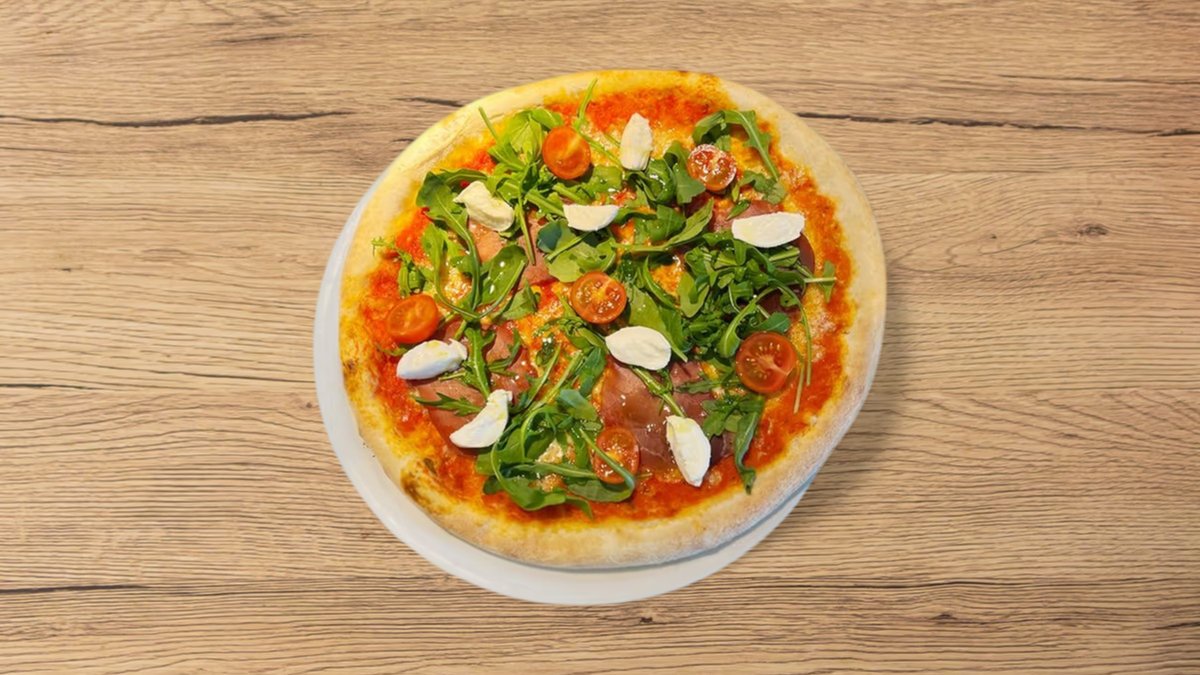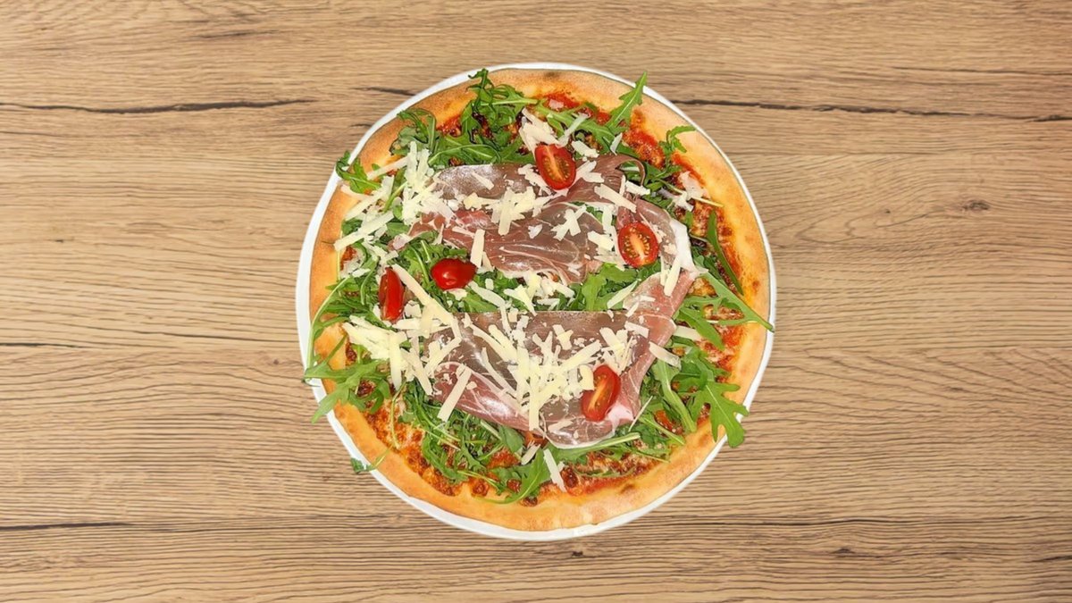 with Parma ham, fresh tomatoes, rocket and Parmesan