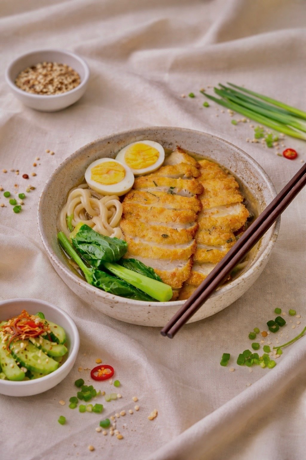 udon noodles in a rich chicken broth with pak choi and boiled egg