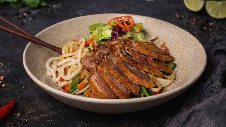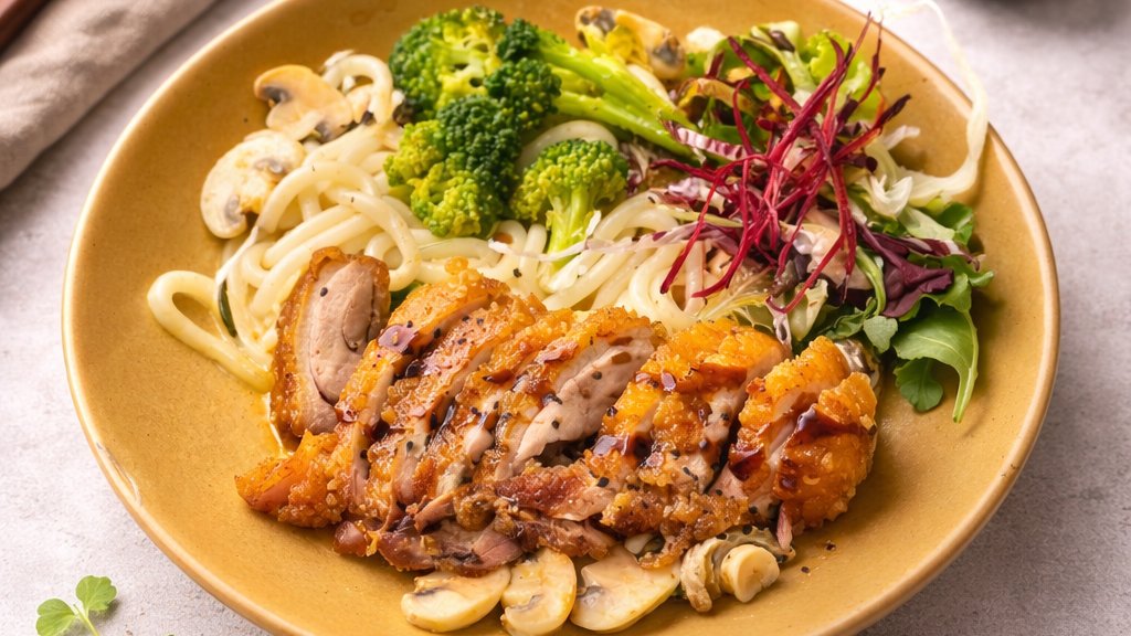 Vietnamese-style pasta with udon noodles, mushrooms, broccoli and creamy truffle sauce