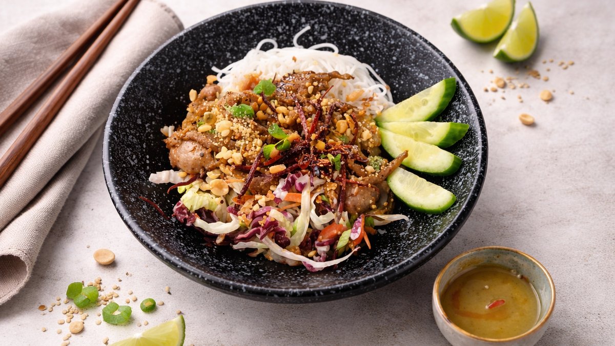 warm rice noodle salad with medium-sautéed beef tips, vegetables, herbs, peanuts and ginger-lime dressing.