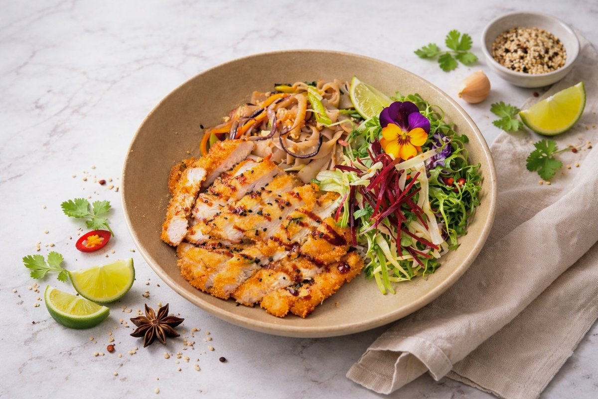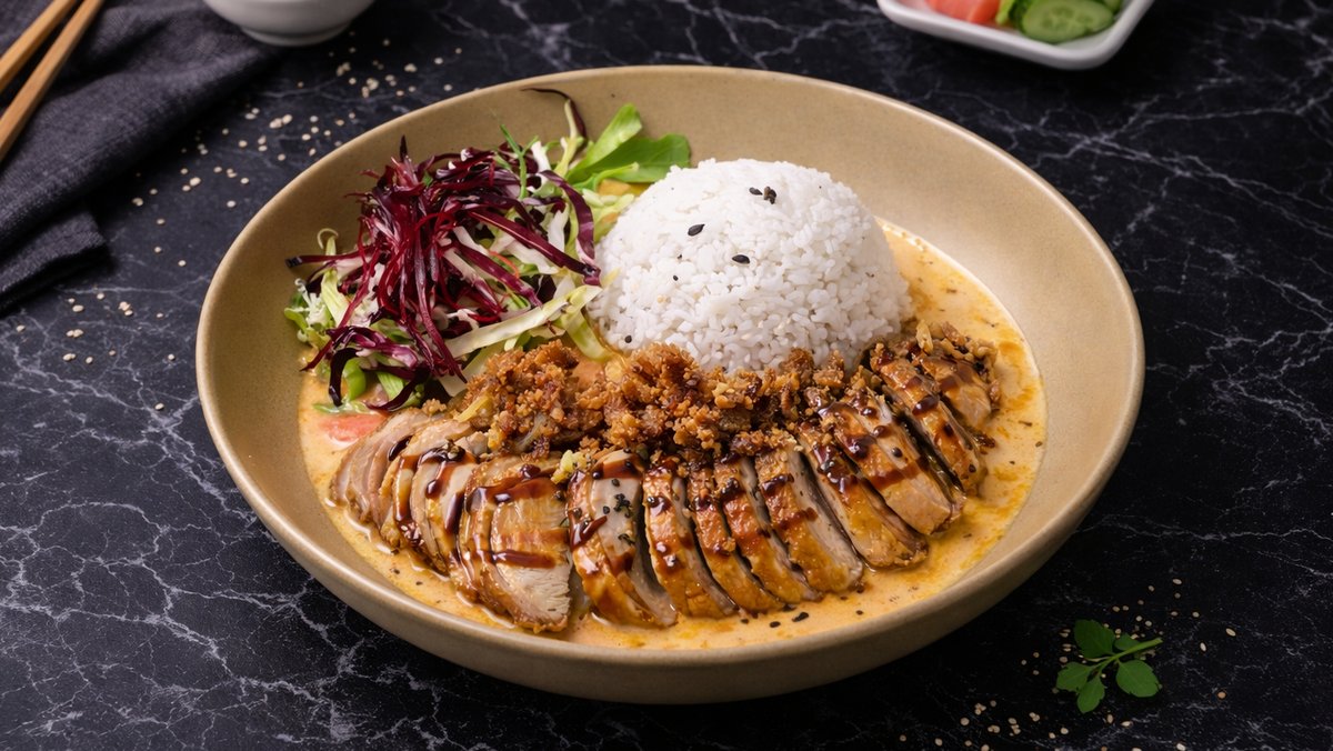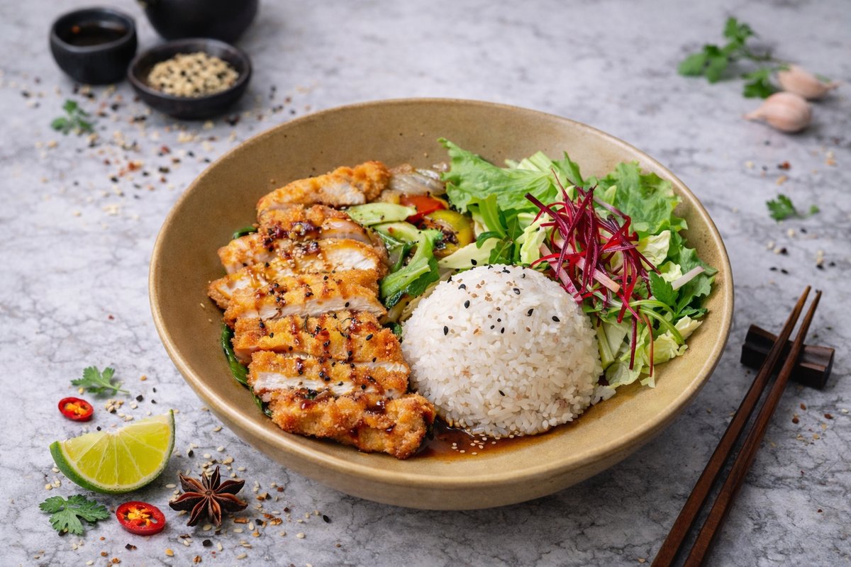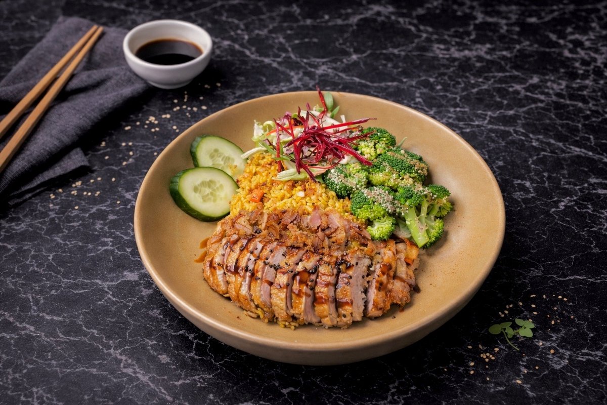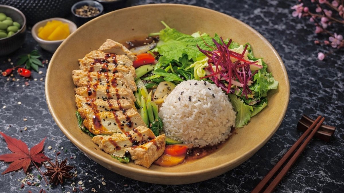 grilled chicken fillet, seasonal vegetables, sweet and spicy sauce, sesame seeds, jasmine rice