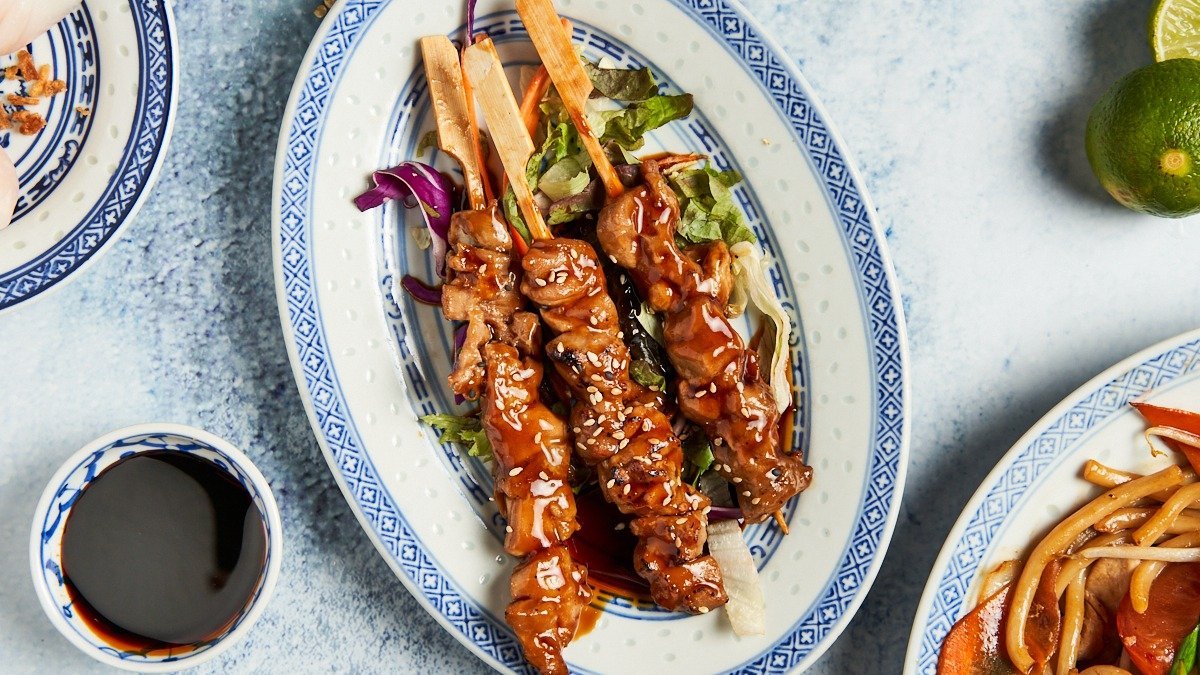 rice noodles on fresh salad with an ingredient of your choice, various vegetables, lemongrass, Asian herbs, peanuts, roasted onions and homemade dressing