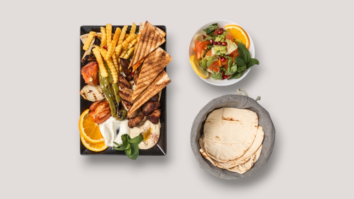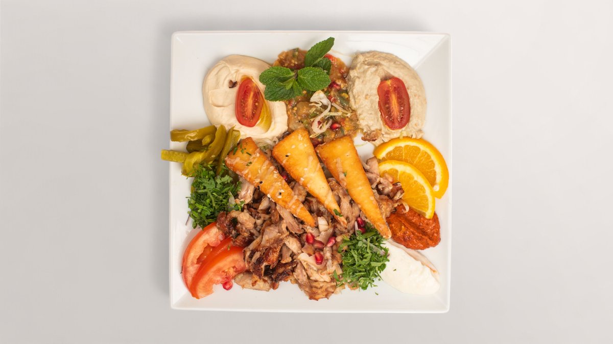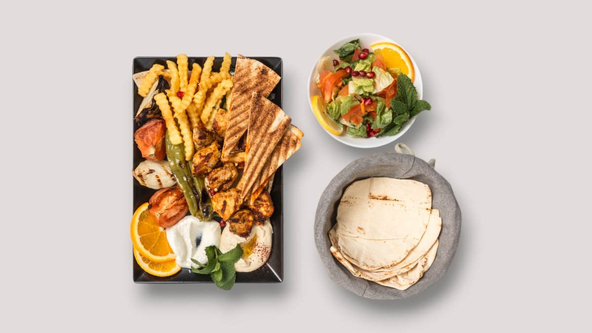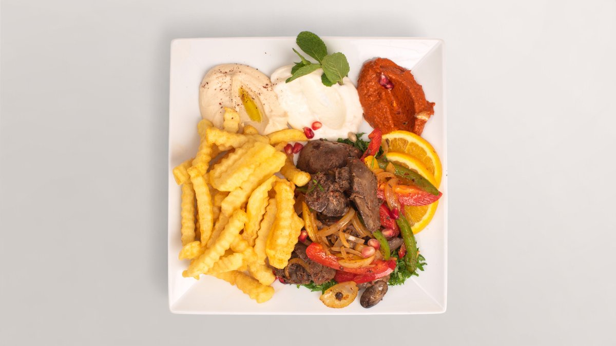 alle Gerichte werden mit Hummus, Knoblauchsoße, Beilage Salat, gegrillter Paprika, Zwiebeln, Tomaten und einer Beilage deiner Wahl zubereitet