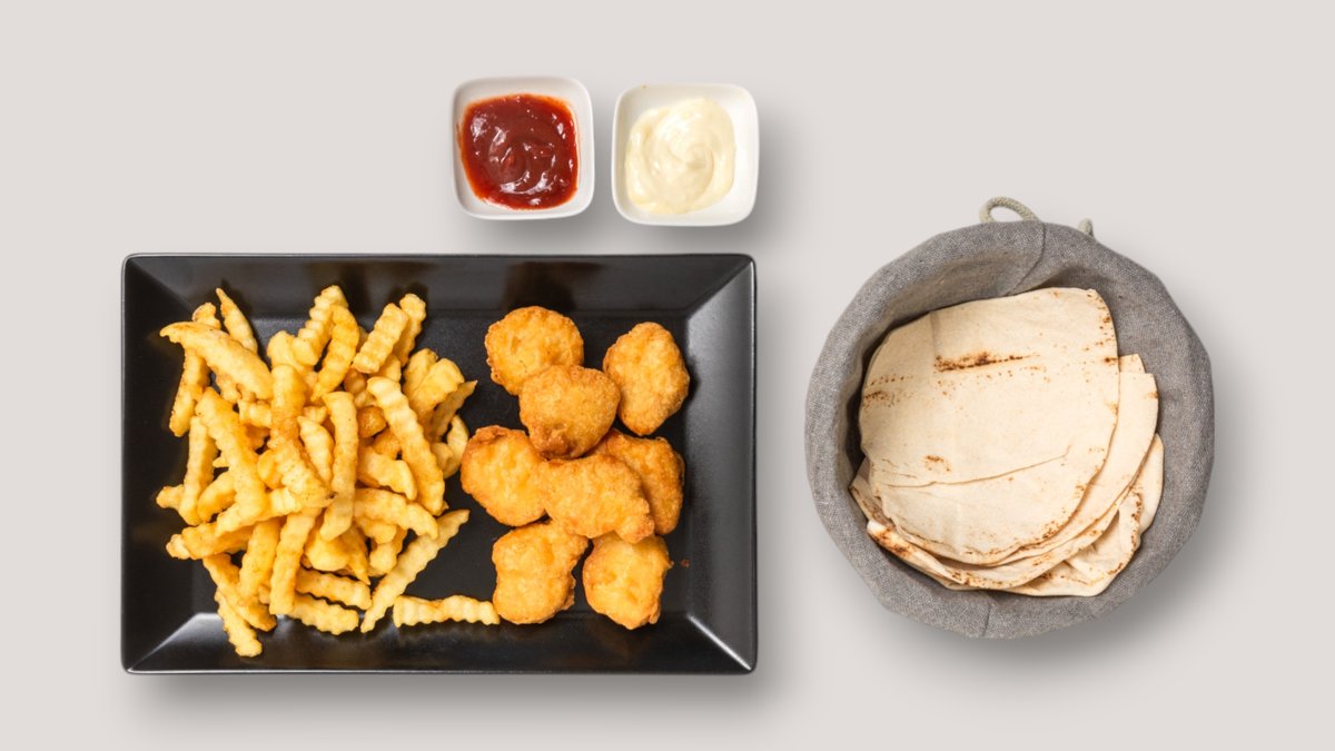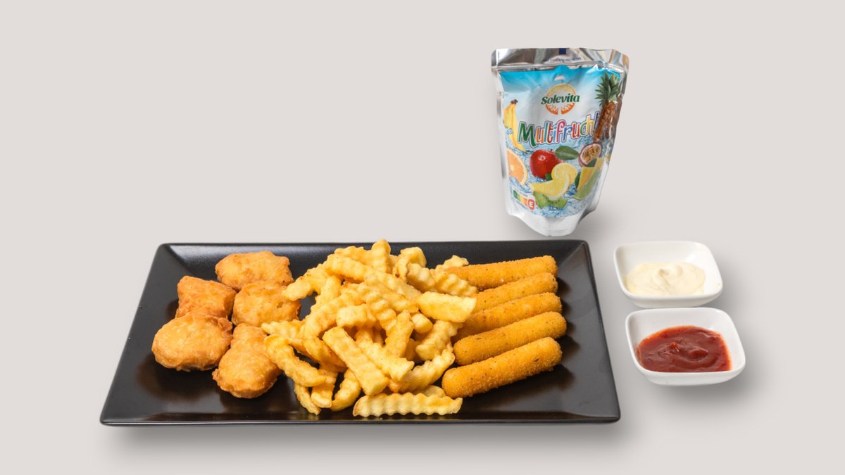 5x Nuggets, 5x Mozzarella Sticks, Pommes frites und 1x Capri-Sun