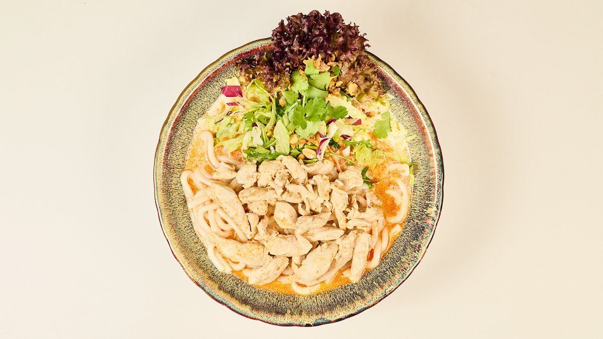 cooked with roasted spices such as ginger and shallots, served with rice noodles refined with spring onions, coriander and fresh lime and chili, served with ingredient of choice