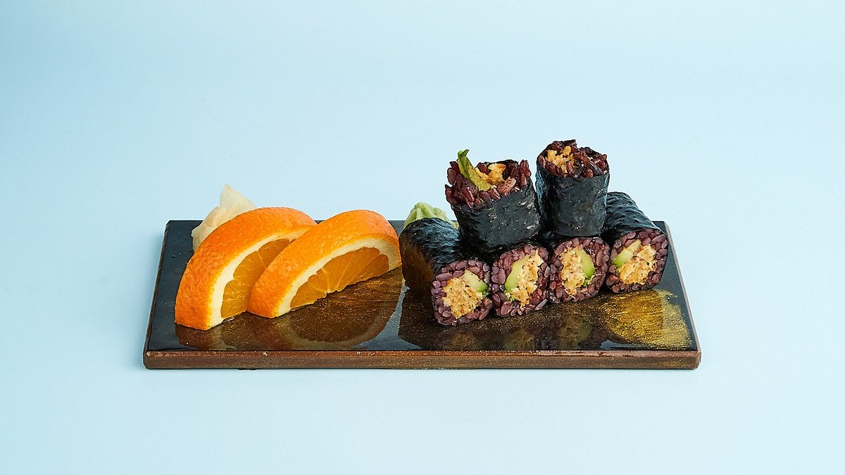 vegan, 1 piece with black rice, needle mushrooms and vegan truffle mayonnaise