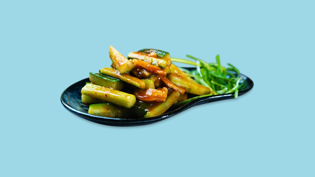 with homemade kimbap in the filling, Japanese radish, bell peppers, cucumbers, kimchi, soy sauce and an ingredient of your choice