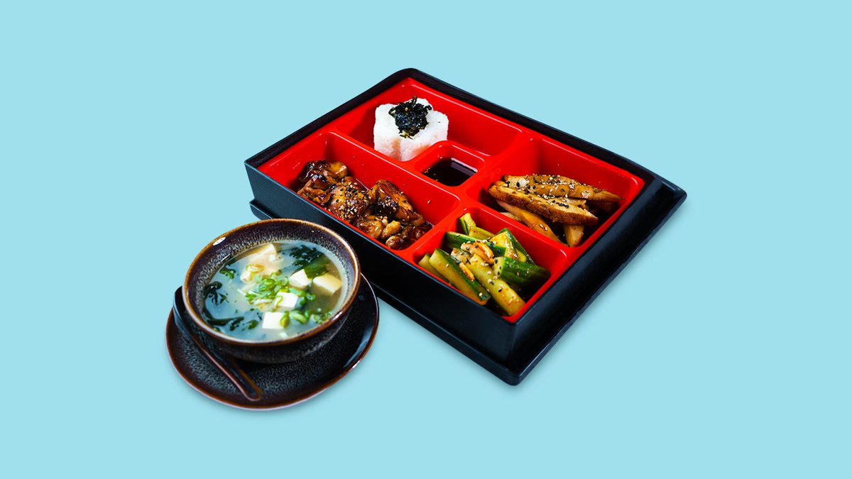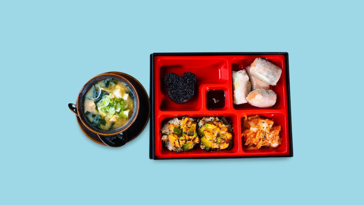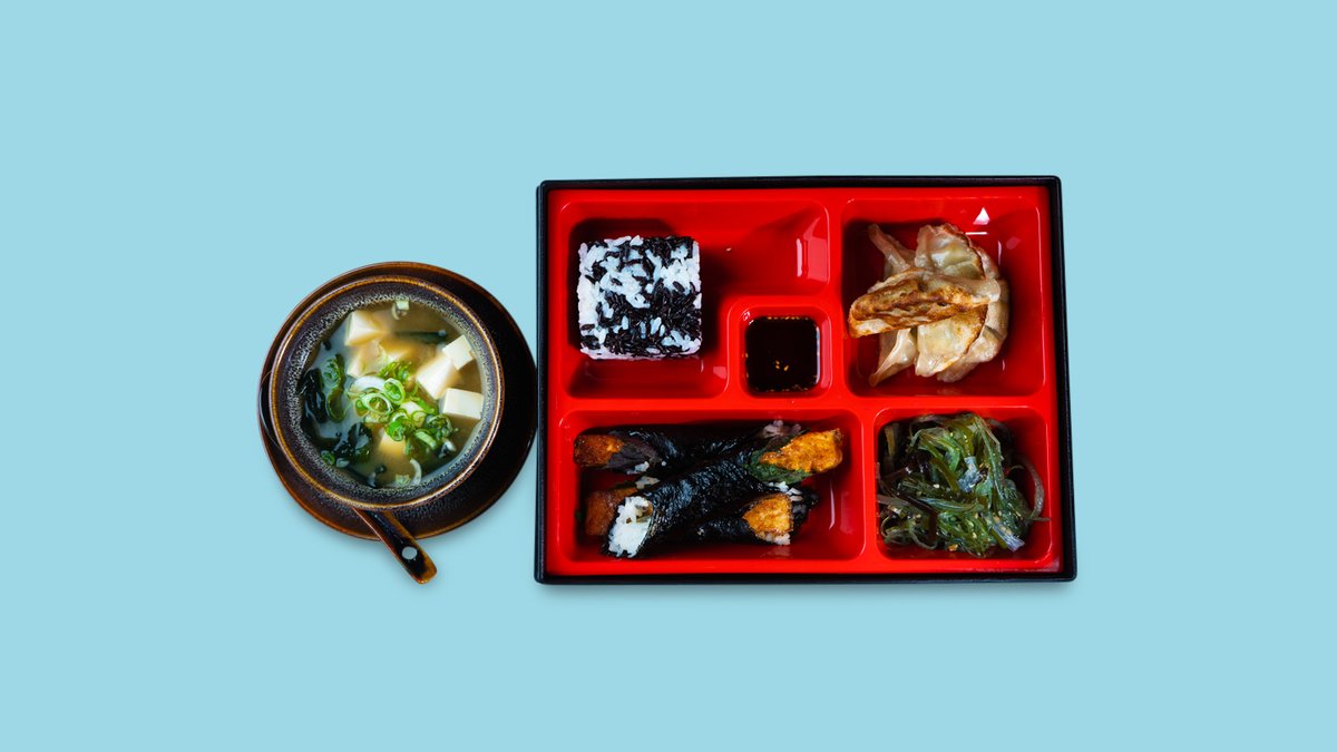 with tofu shiso, vegan gyoza and seaweed salad, served with brown rice and miso soup