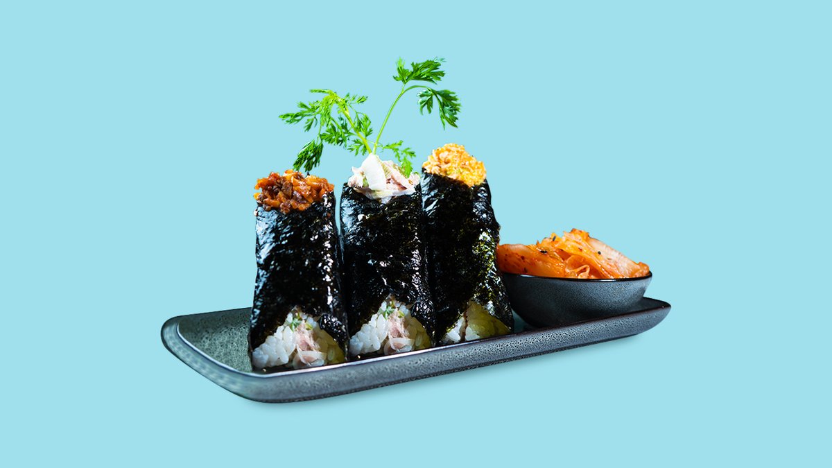 with homemade tofu, garlic, chili, wrapped in shiso leaves and nori