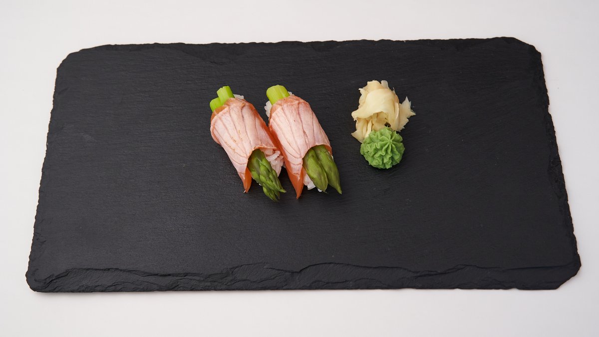 panierter grüner Spargel und Frischkäse, umwickelt mit flambiertem Thunfisch