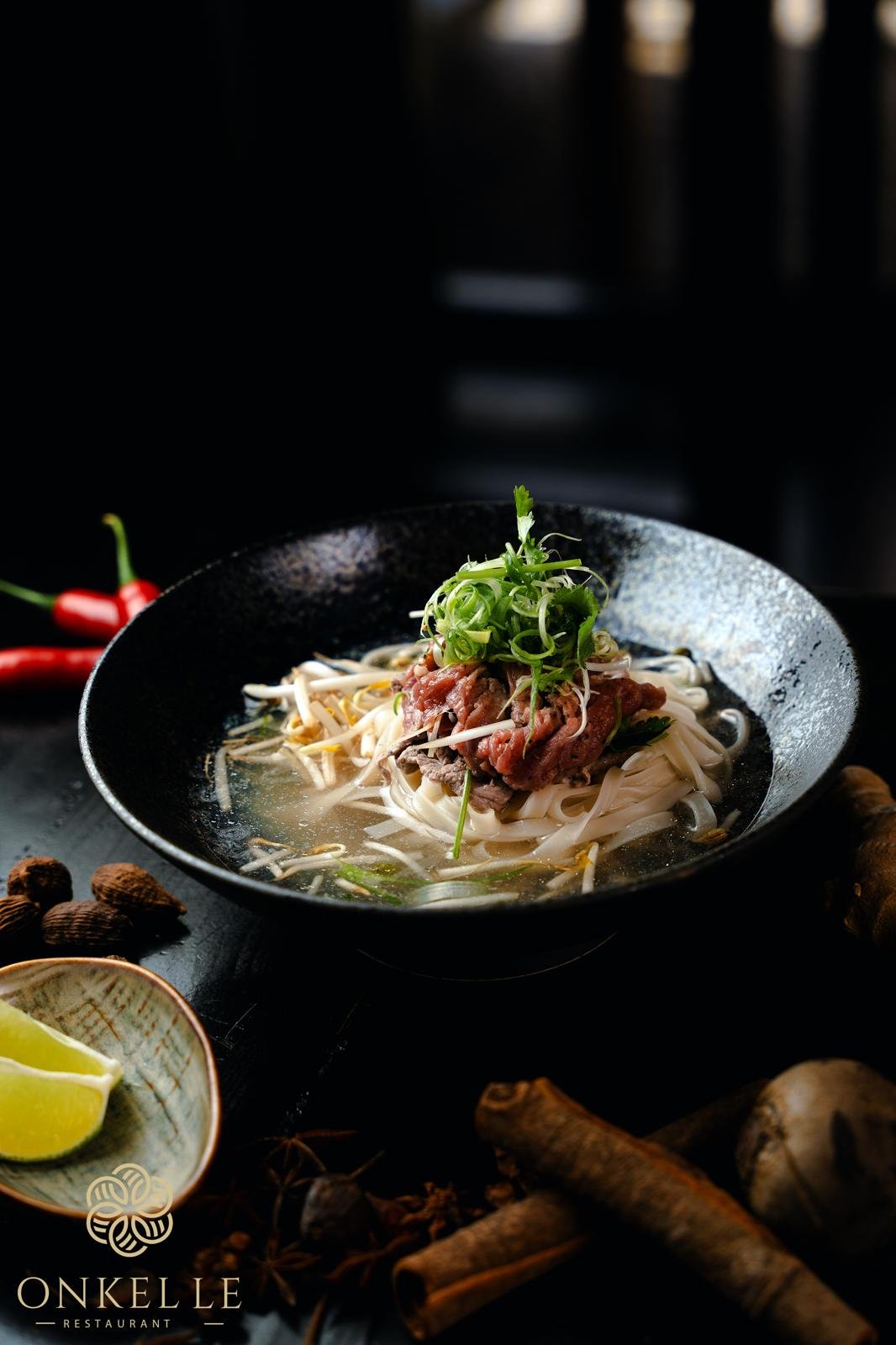 mit Bindknochenbrübe, Reisbandnudeln, Ingwer, Zimt, Anisstern, Sojasprossen, Koriander, Frühlingszwiebeln und einer Zutat deiner Wahl