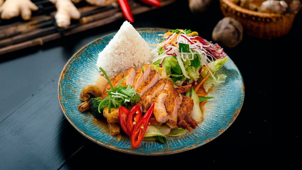 mit Gemüse in roter Kokosmilch-Currysoße und einer Zutat deiner Wahl